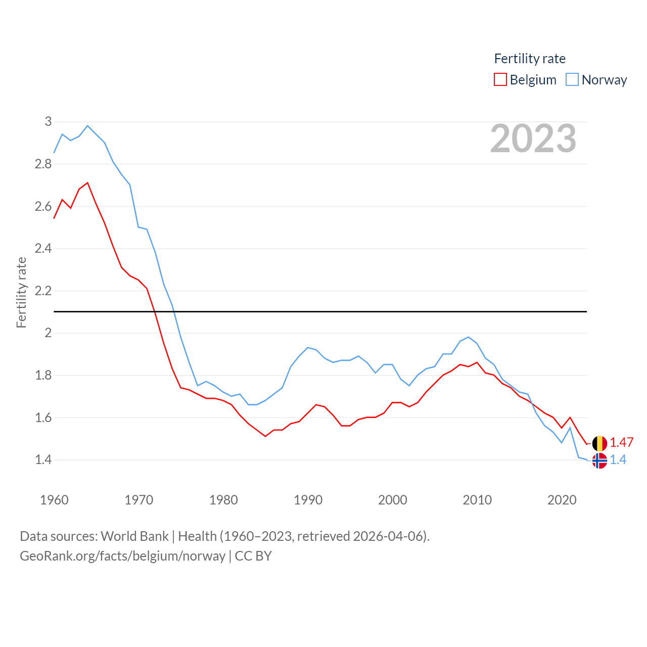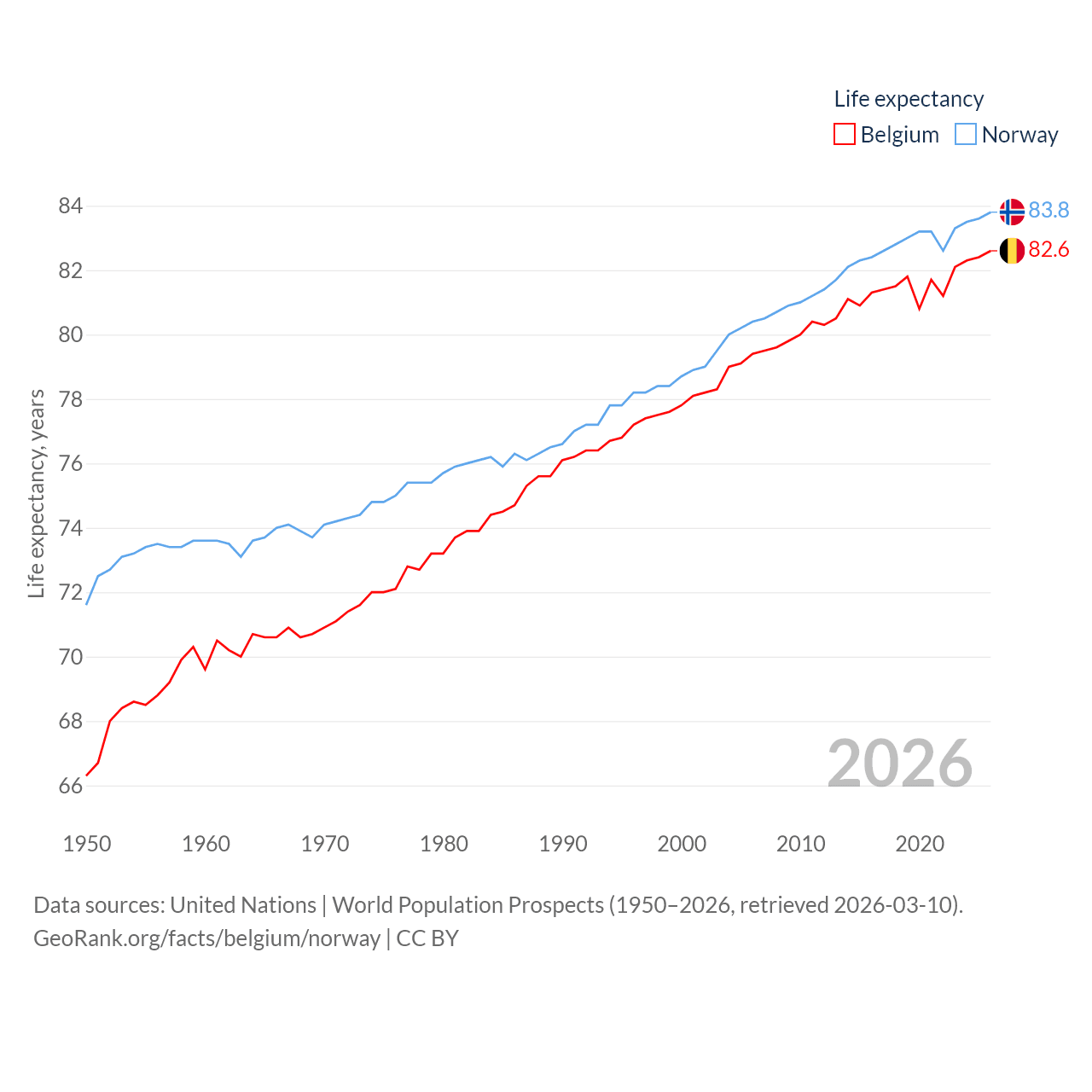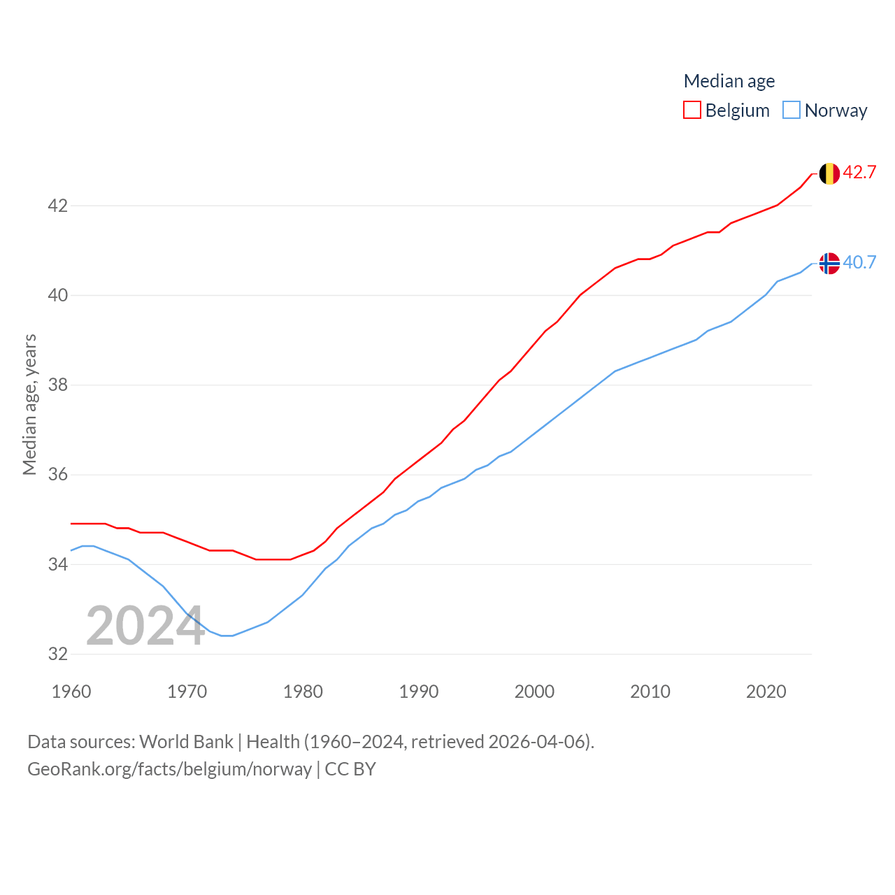 Belgium has a population of 11.9M (ranked 82/197), compared with 5.57M in Norway (ranked 118/197). Belgium's land area is 11,774 sq mi versus 140,645 sq mi for Norway (ranked 136th vs. 62nd).