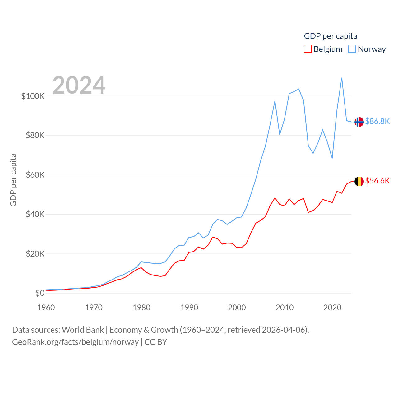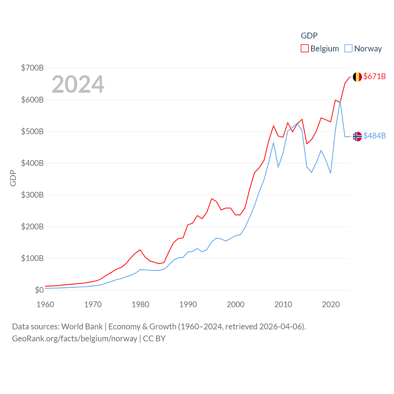 By GDP, Belgium ranks 23/197 ($671B) and Norway ranks 32/197 ($484B). By GDP per capita, Belgium ranks 18/197 ($56,615), while Norway ranks 8/197 ($86,785).