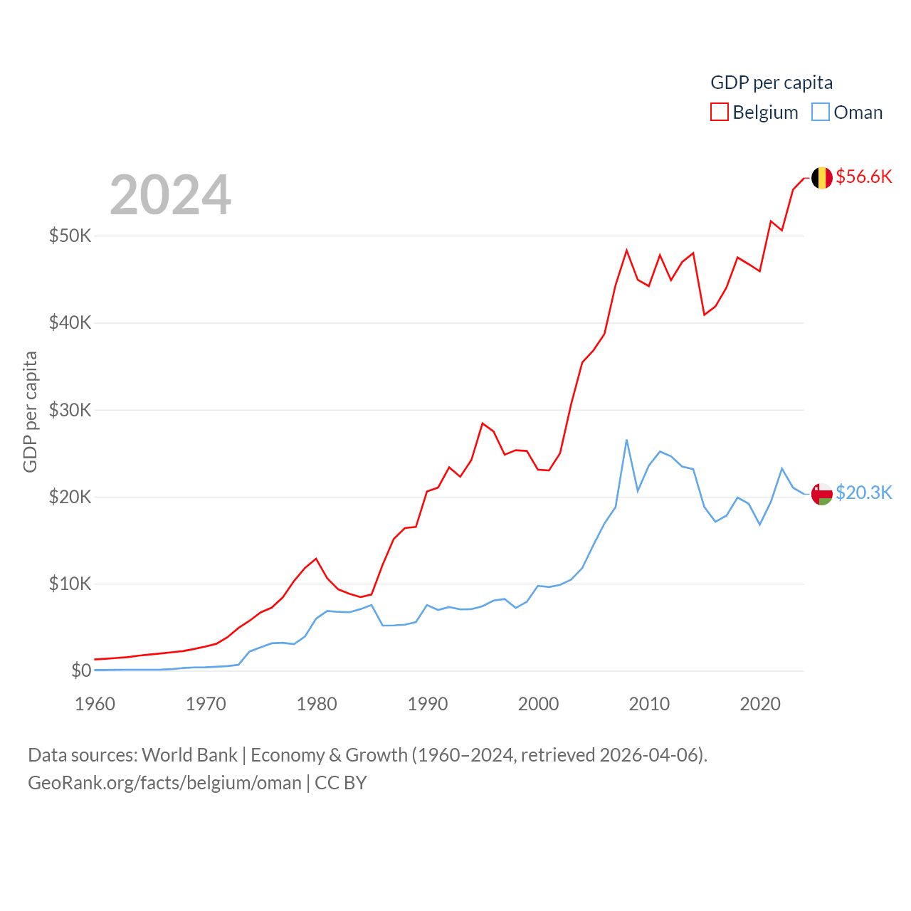 By GDP, Belgium ranks 23/197 ($671B) and Oman ranks 70/197 ($107B). By GDP per capita, Belgium ranks 18/197 ($56,615), while Oman ranks 57/197 ($20,285).