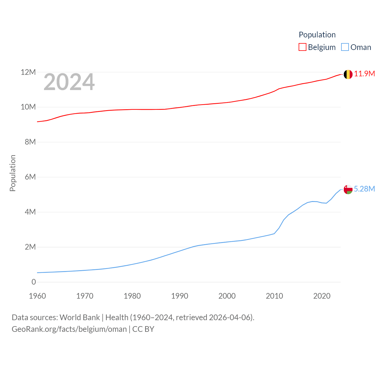 Belgium has a population of 11.9M (ranked 82/197), compared with 5.28M in Oman (ranked 124/197). Belgium's land area is 11,774 sq mi versus 119,499 sq mi for Oman (ranked 136th vs. 68th).