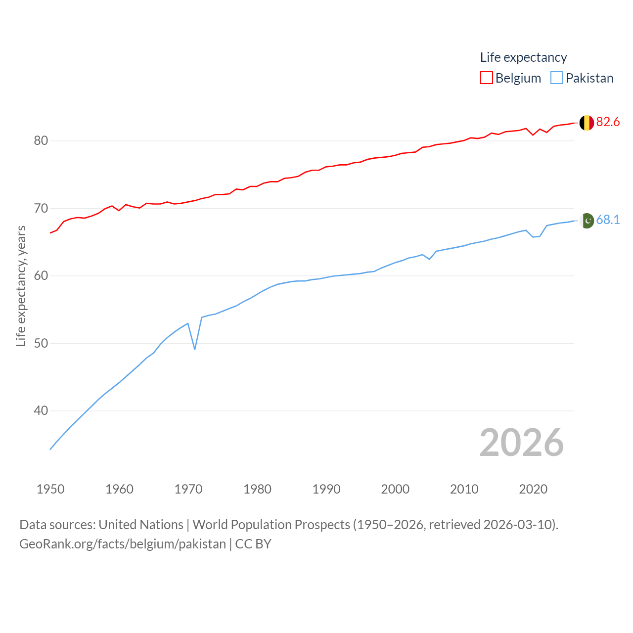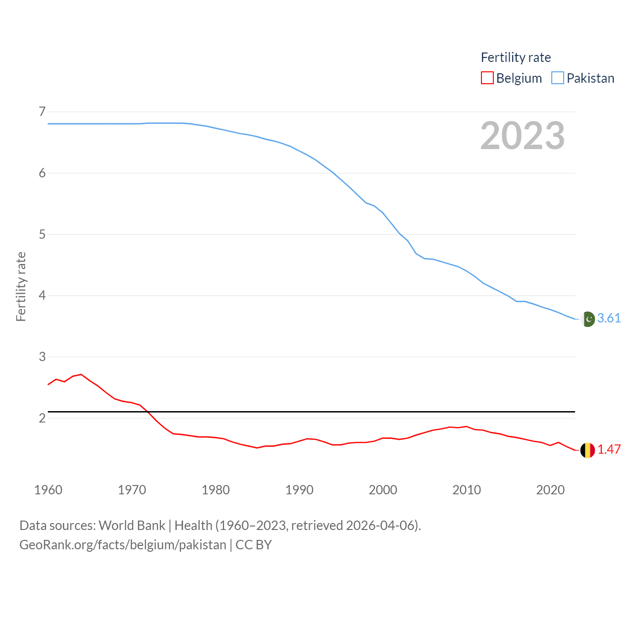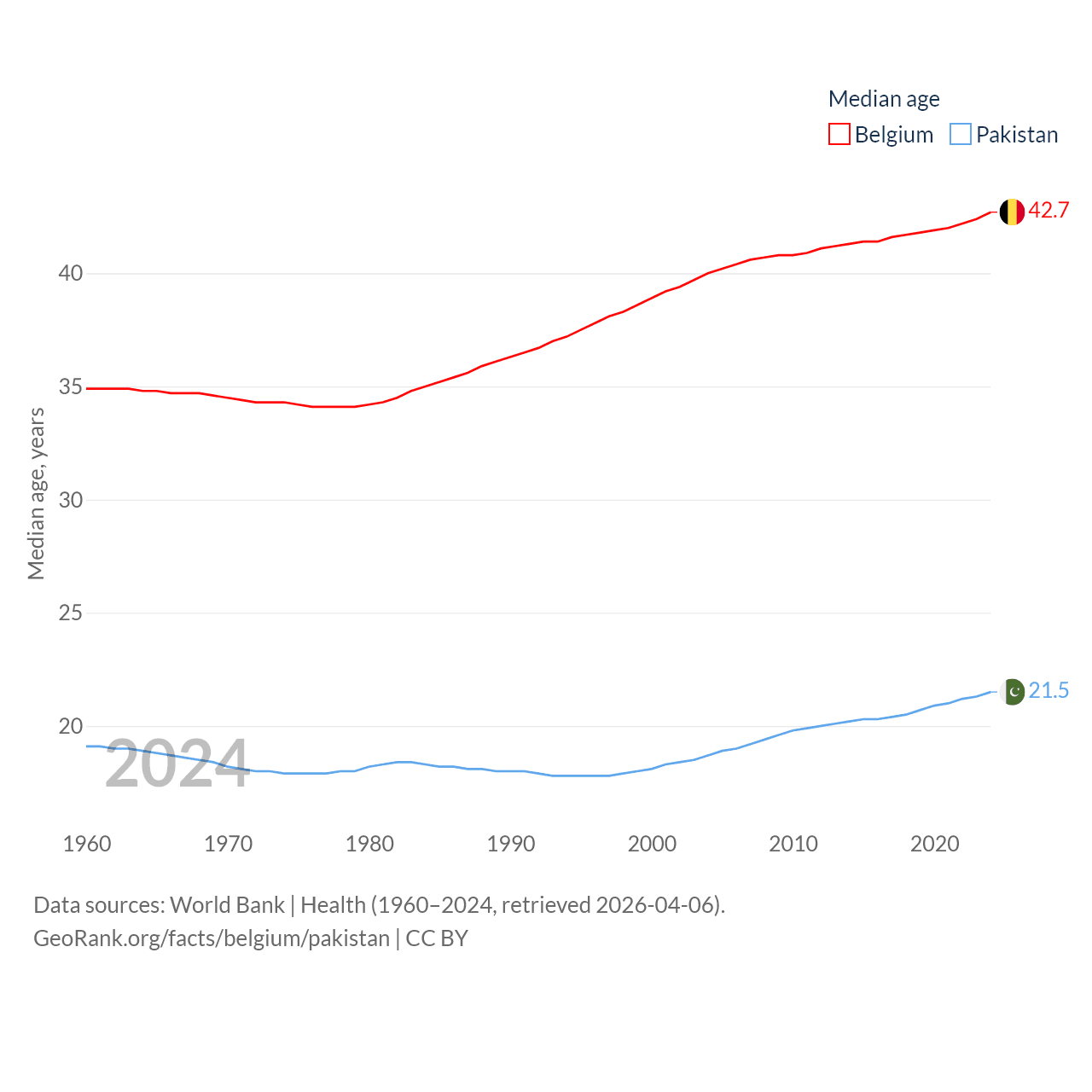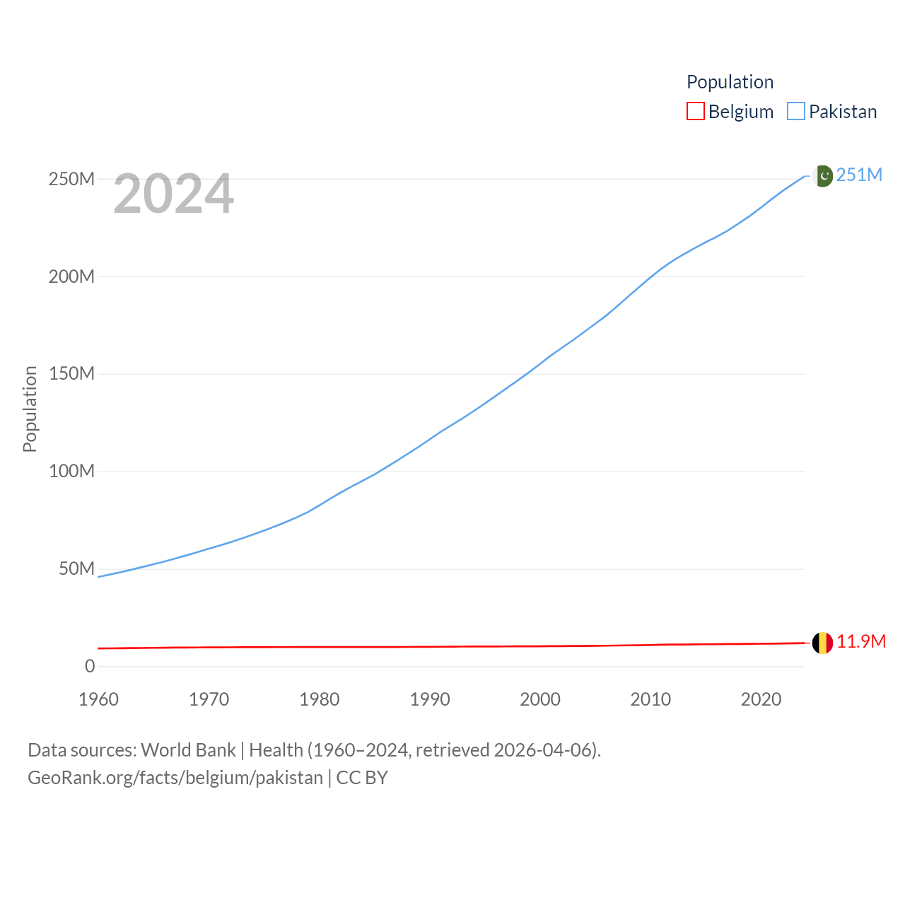 Belgium has a population of 11.9M (ranked 82/197), compared with 251M in Pakistan (ranked 5/197). Belgium's land area is 11,774 sq mi versus 297,638 sq mi for Pakistan (ranked 136th vs. 35th).