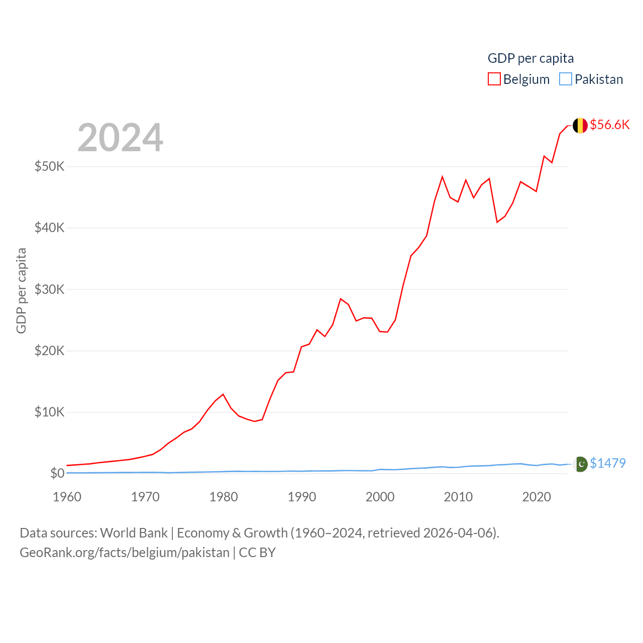 By GDP, Belgium ranks 23/197 ($671B) and Pakistan ranks 43/197 ($372B). By GDP per capita, Belgium ranks 18/197 ($56,615), while Pakistan ranks 163/197 ($1,479).