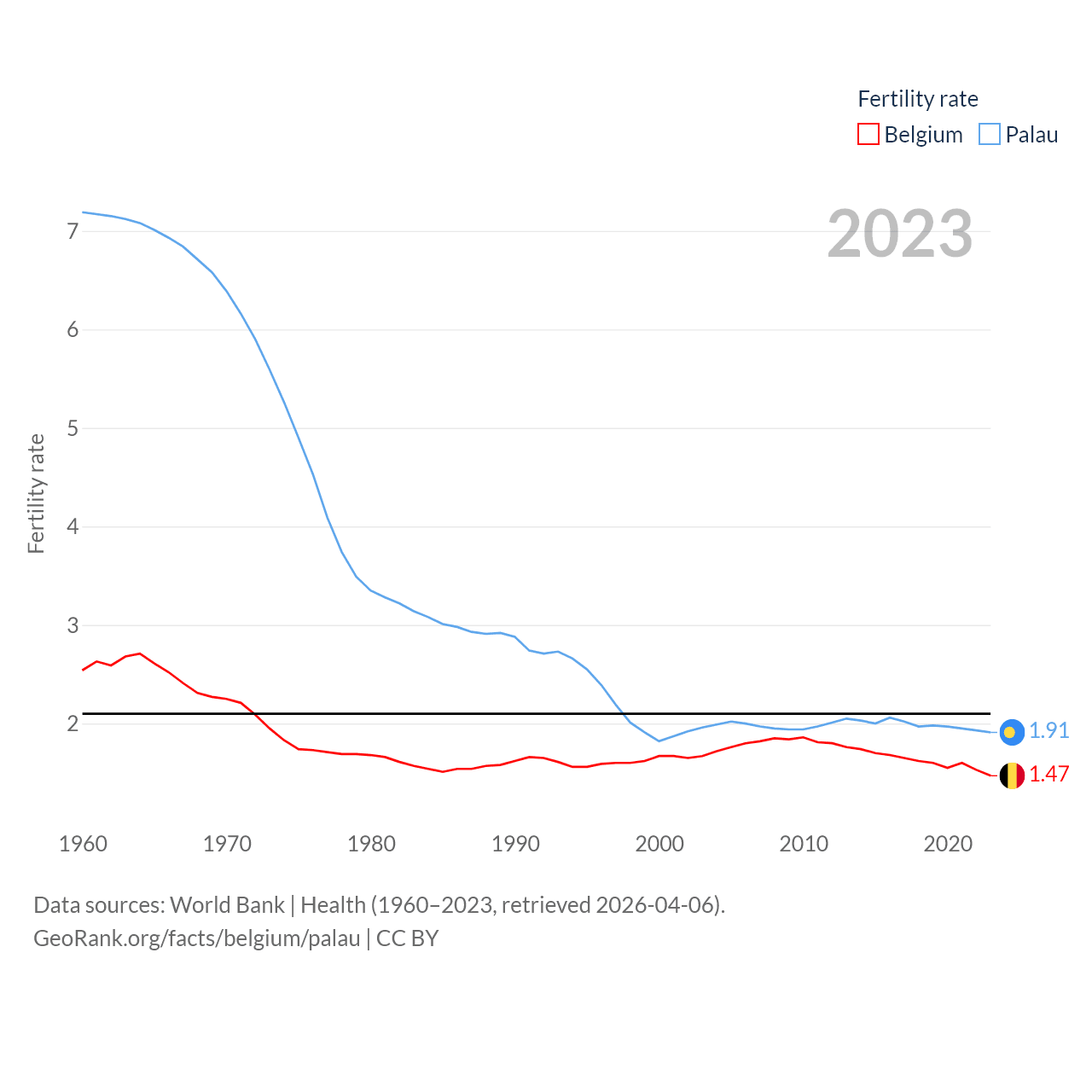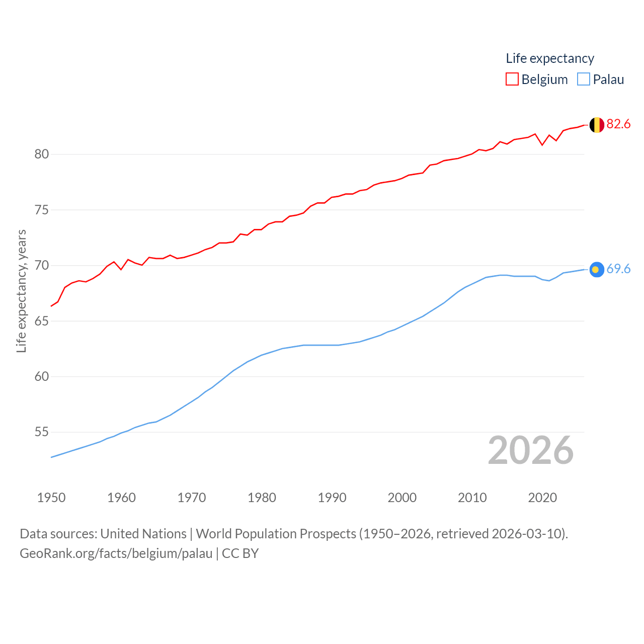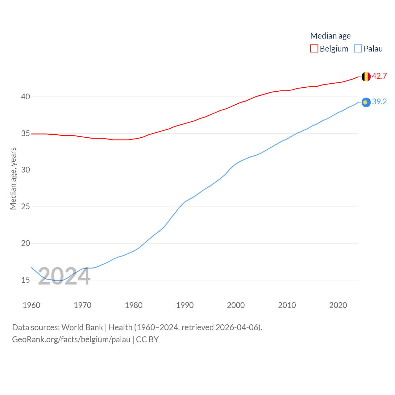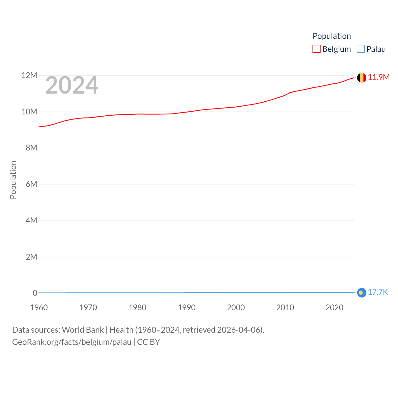 Belgium has a population of 11.9M (ranked 82/197), compared with 17.7K in Palau (ranked 194/197). Belgium's land area is 11,774 sq mi versus 177.6 sq mi for Palau (ranked 136th vs. 180th).