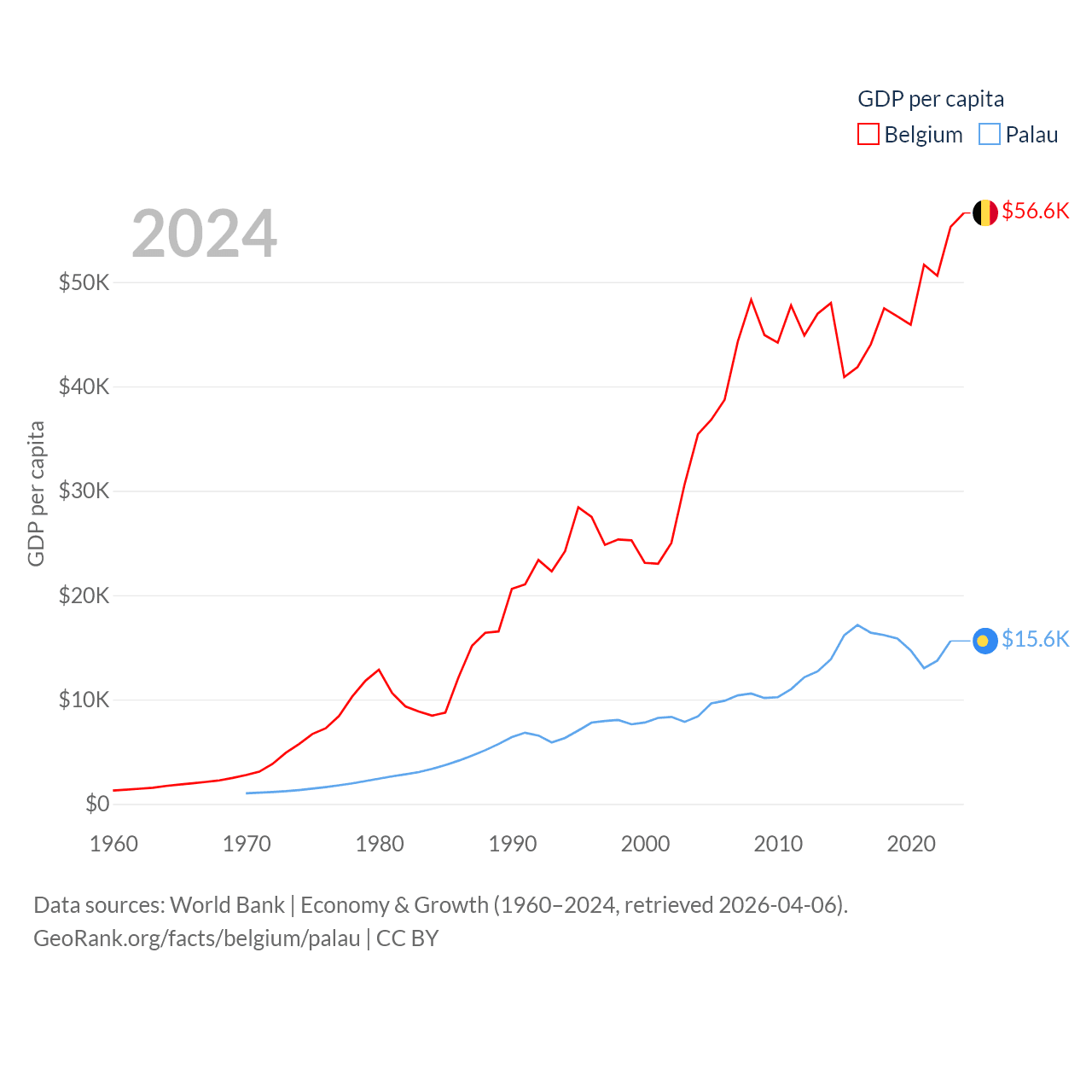 By GDP, Belgium ranks 23/197 ($671B) and Palau ranks 194/197 ($277M). By GDP per capita, Belgium ranks 18/197 ($56,615), while Palau ranks 67/197 ($15,611).