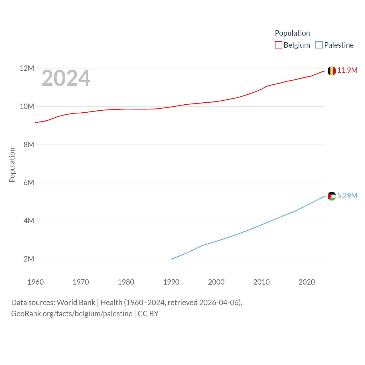 Belgium has a population of 11.9M (ranked 82/197), compared with 5.29M in Palestine (ranked 122/197). Belgium's land area is 11,774 sq mi versus 2,326 sq mi for Palestine (ranked 136th vs. 164th).