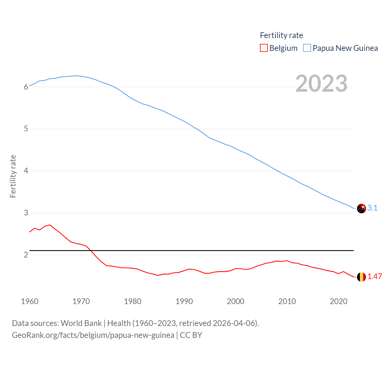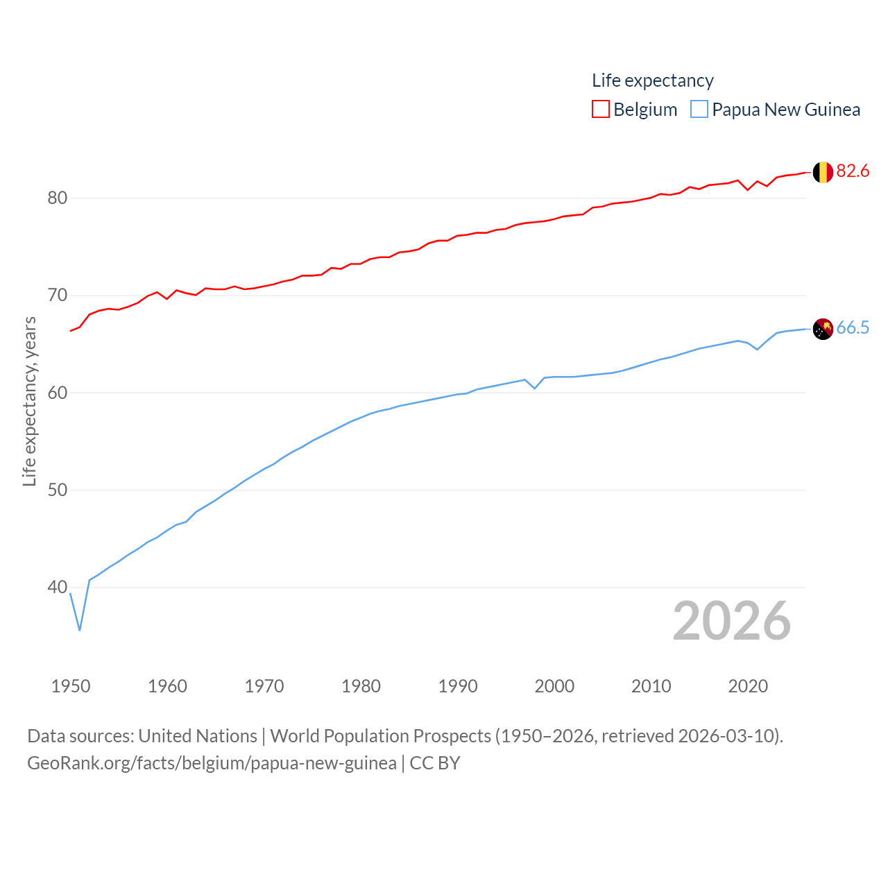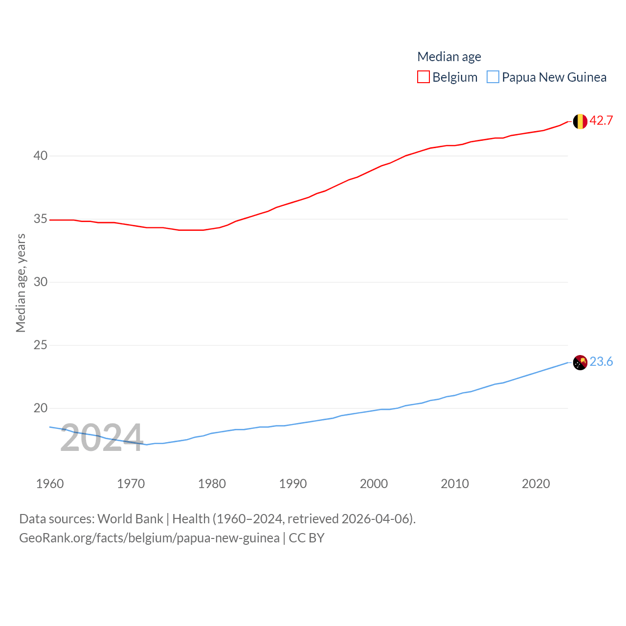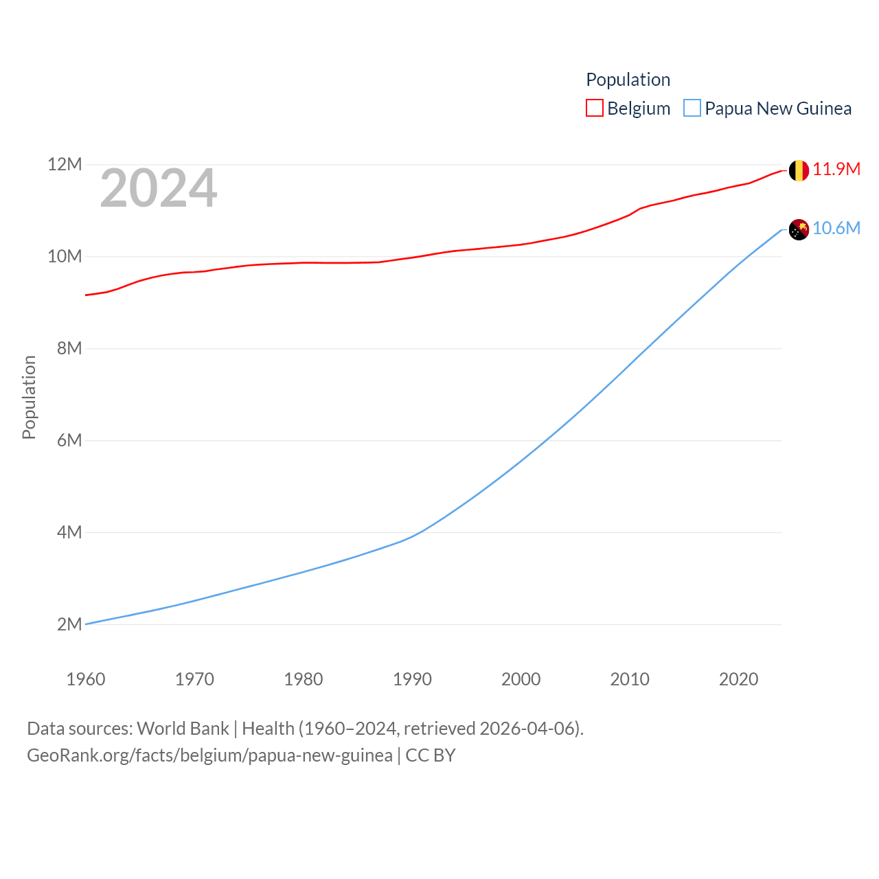 Belgium has a population of 11.9M (ranked 82/197), compared with 10.6M in Papua New Guinea (ranked 92/197). Belgium's land area is 11,774 sq mi versus 174,850 sq mi for Papua New Guinea (ranked 136th vs. 54th).