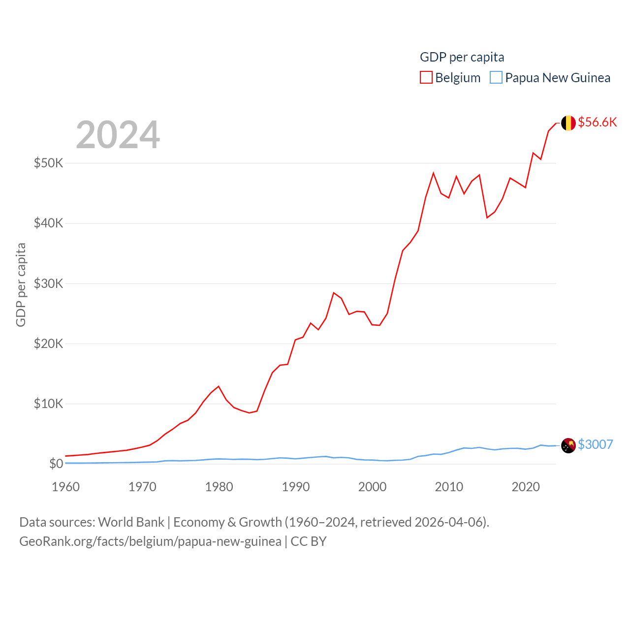 By GDP, Belgium ranks 23/197 ($671B) and Papua New Guinea ranks 110/197 ($31.8B). By GDP per capita, Belgium ranks 18/197 ($56,615), while Papua New Guinea ranks 140/197 ($3,007).