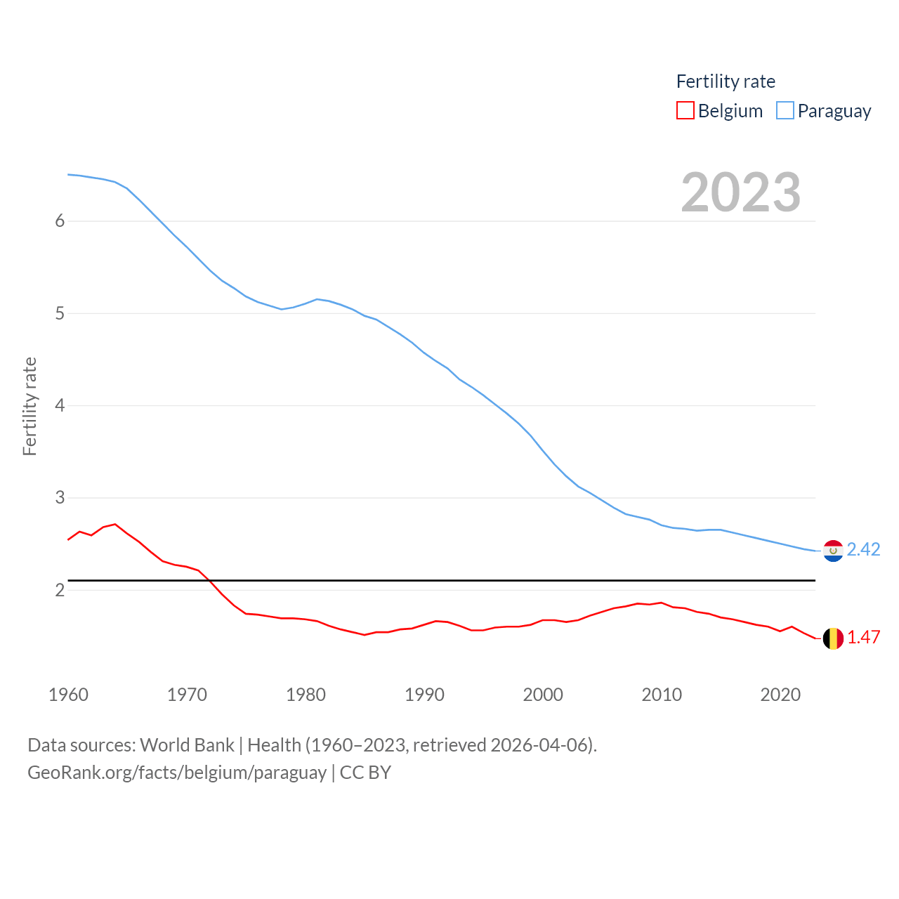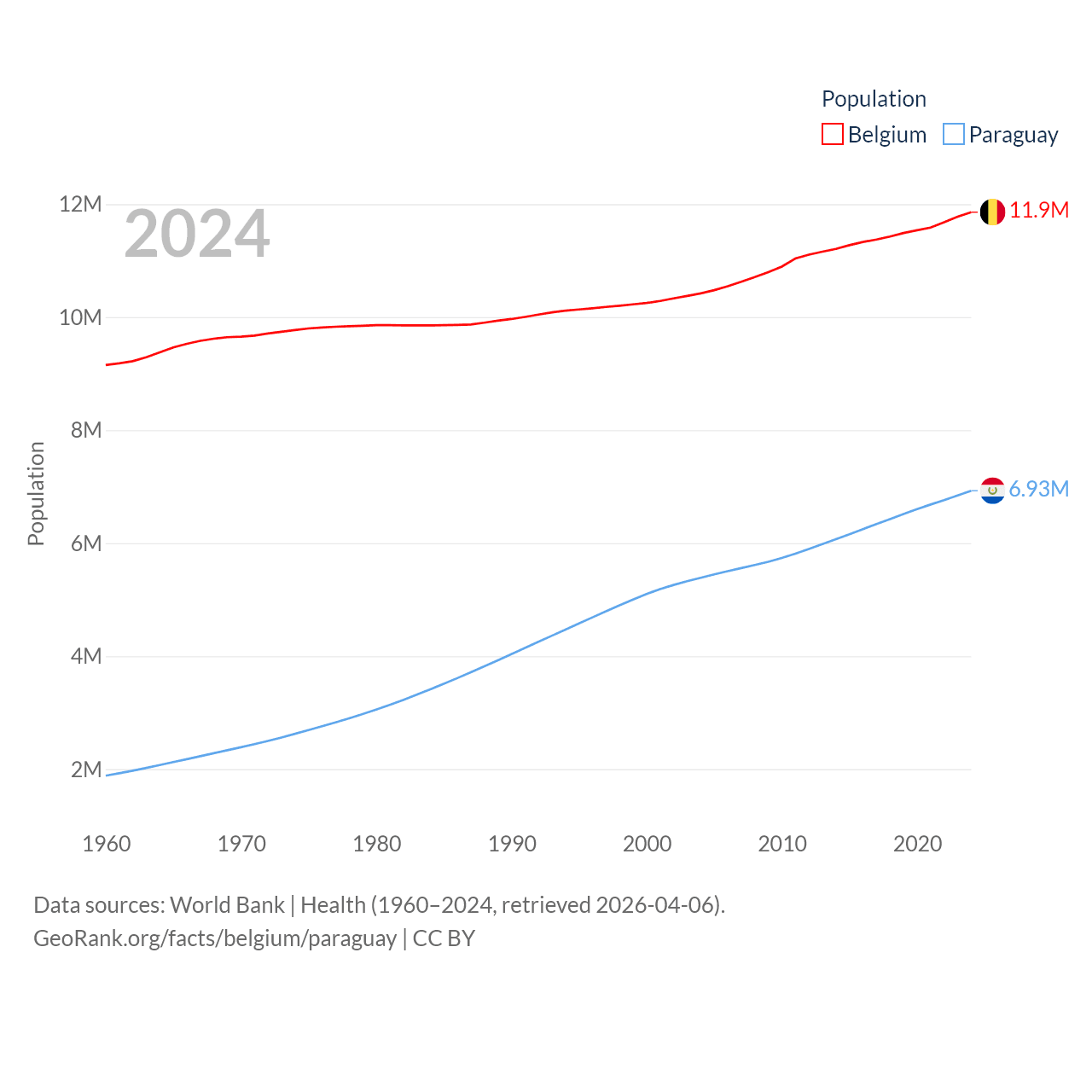 Belgium has a population of 11.9M (ranked 82/197), compared with 6.93M in Paraguay (ranked 107/197). Belgium's land area is 11,774 sq mi versus 152,901 sq mi for Paraguay (ranked 136th vs. 59th).