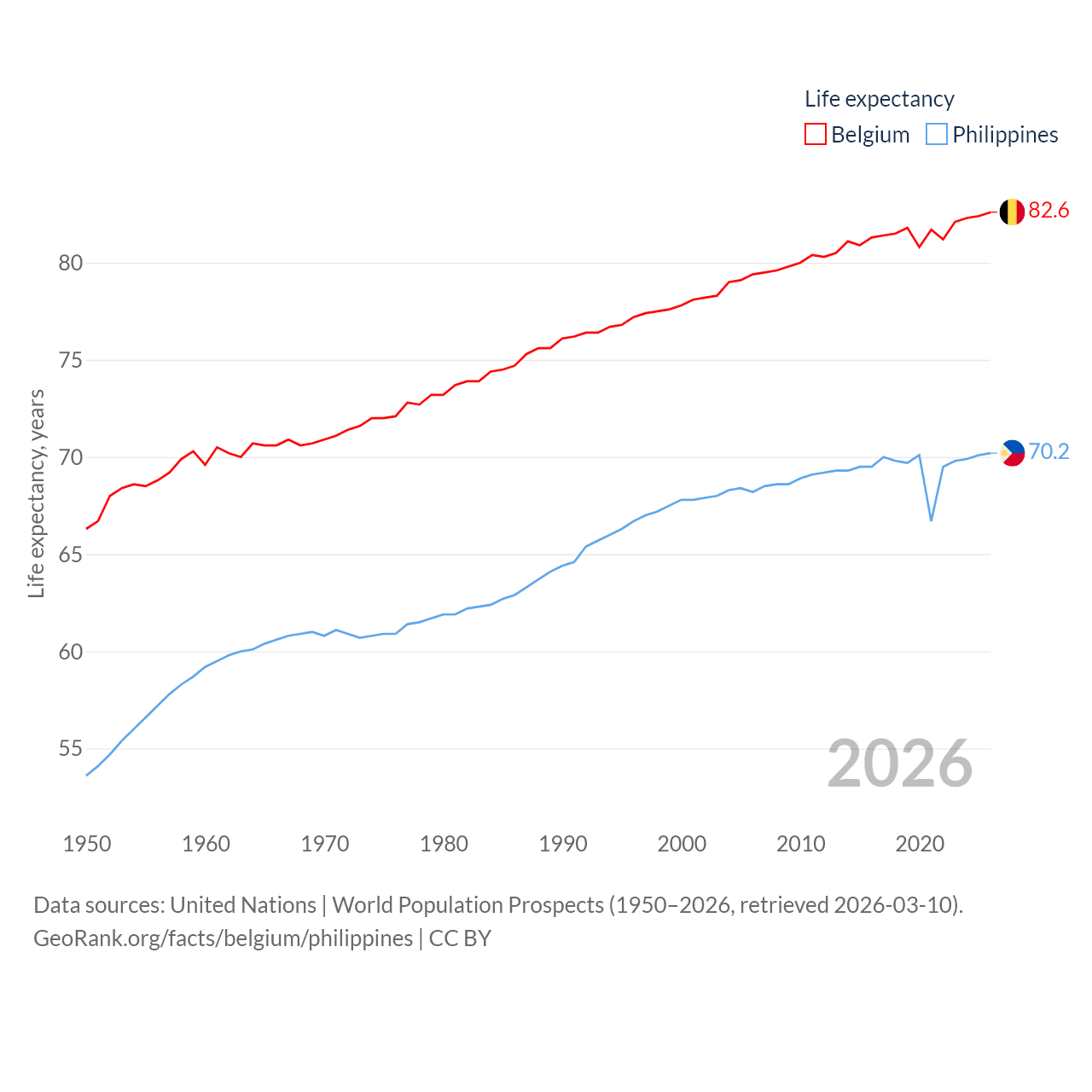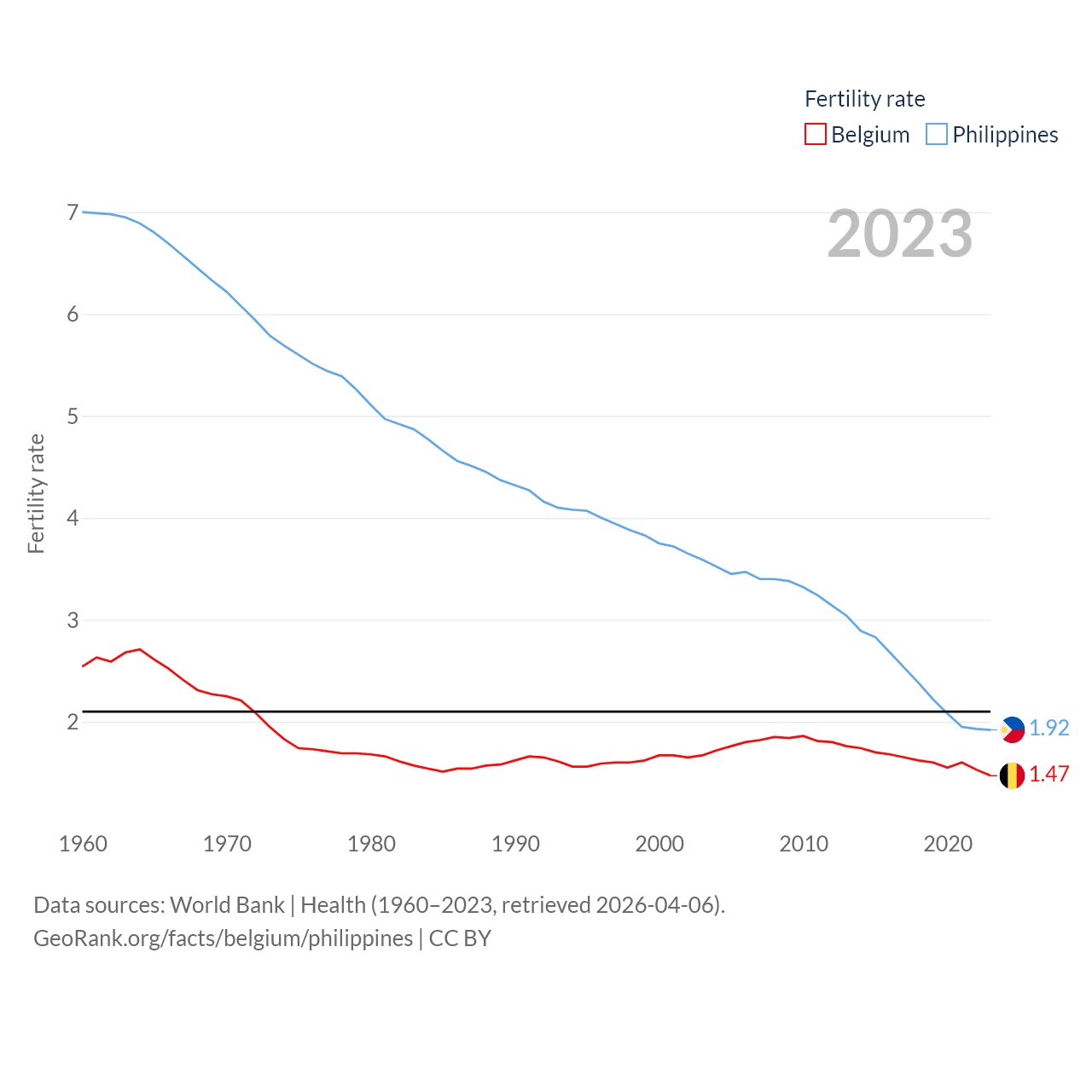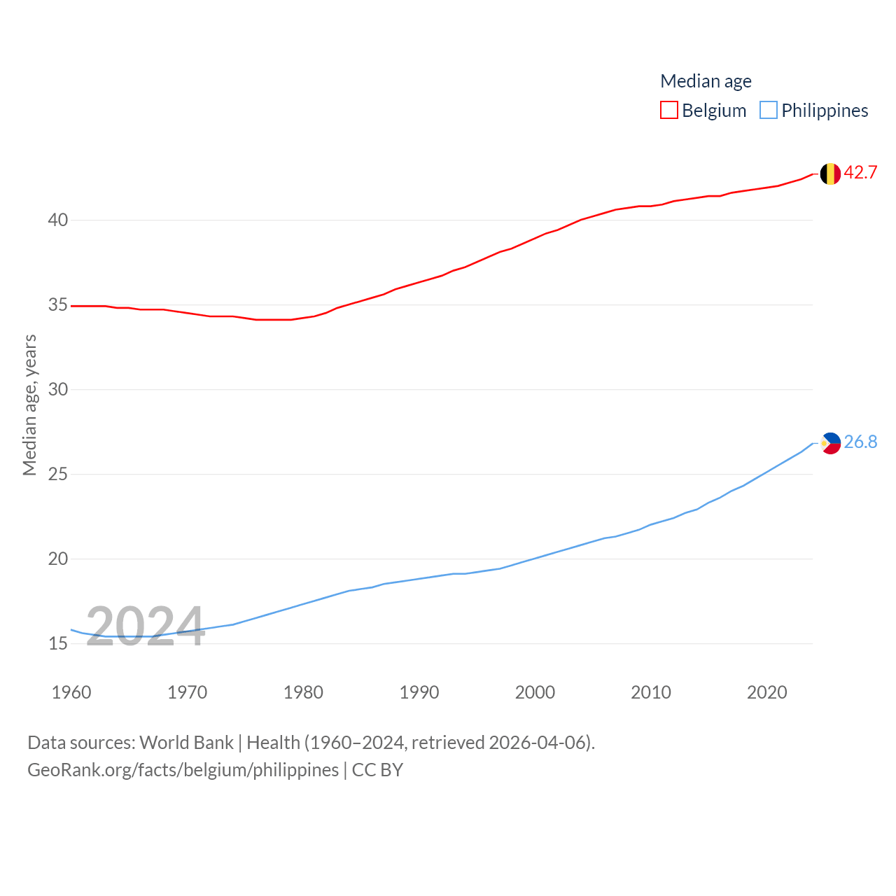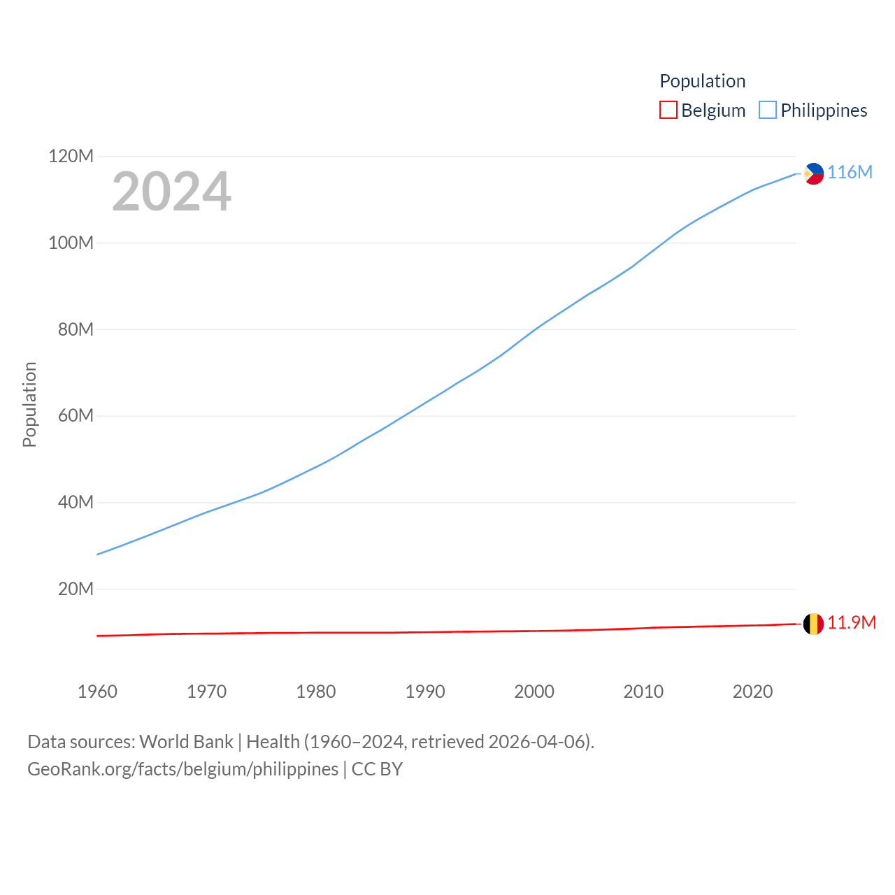 Belgium has a population of 11.9M (ranked 82/197), compared with 116M in The Philippines (ranked 14/197). Belgium's land area is 11,774 sq mi versus 115,124 sq mi for The Philippines (ranked 136th vs. 71st).