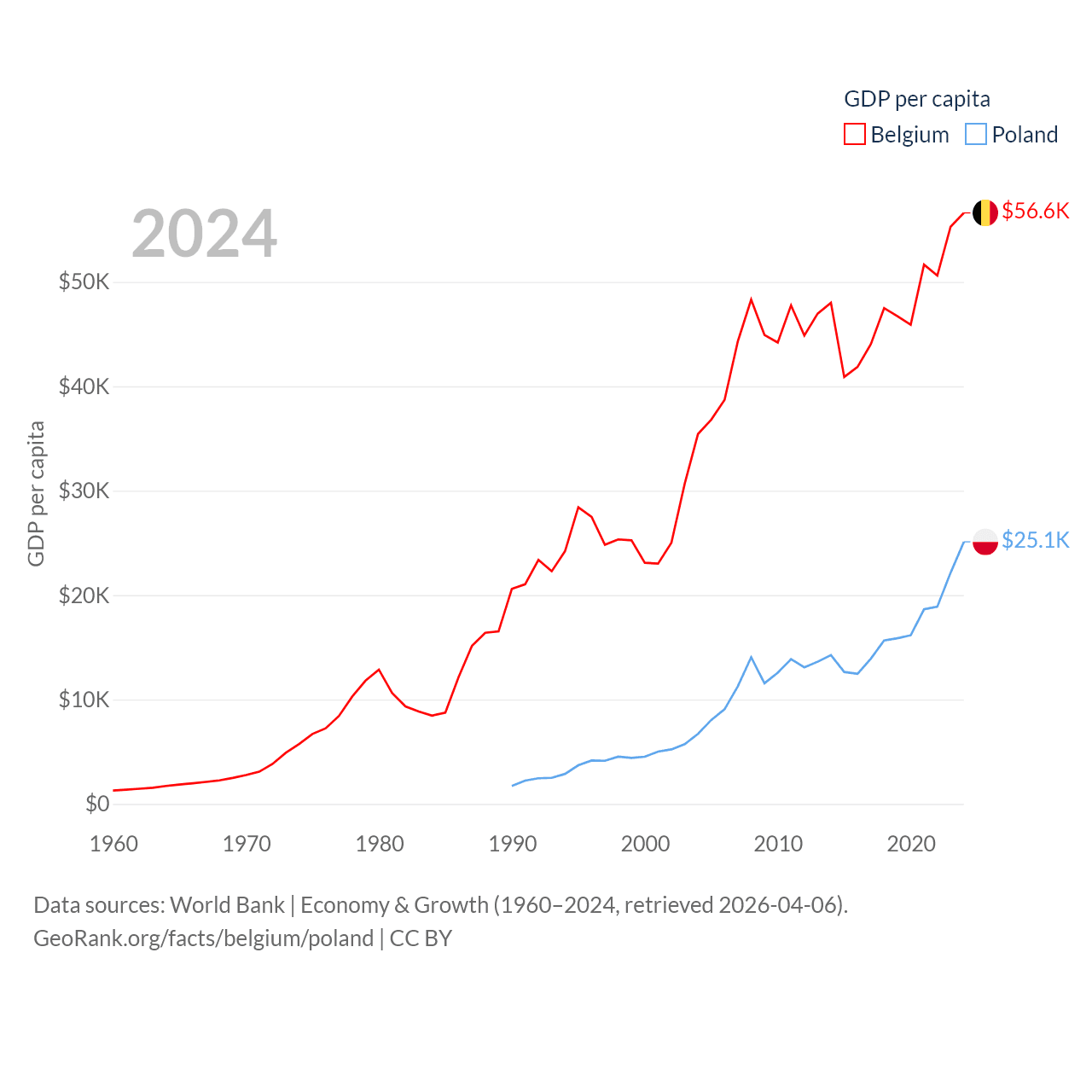 By GDP, Belgium ranks 23/197 ($671B) and Poland ranks 21/197 ($918B). By GDP per capita, Belgium ranks 18/197 ($56,615), while Poland ranks 48/197 ($25,104).