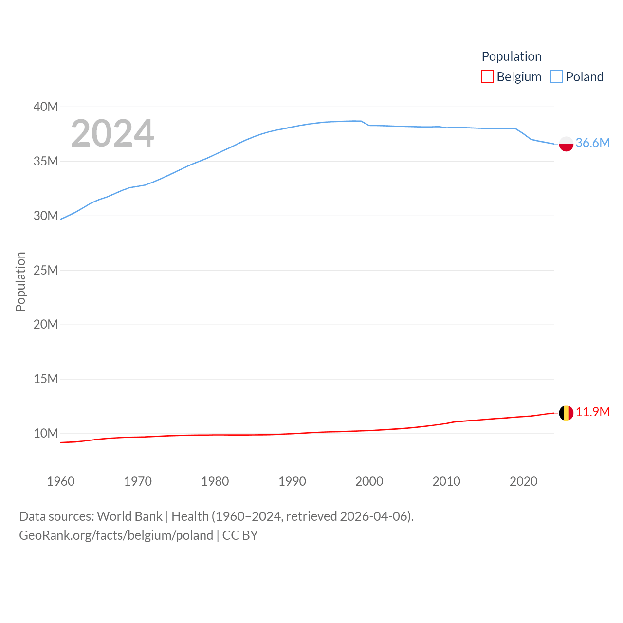 Belgium has a population of 11.9M (ranked 82/197), compared with 36.6M in Poland (ranked 42/197). Belgium's land area is 11,774 sq mi versus 118,252 sq mi for Poland (ranked 136th vs. 69th).