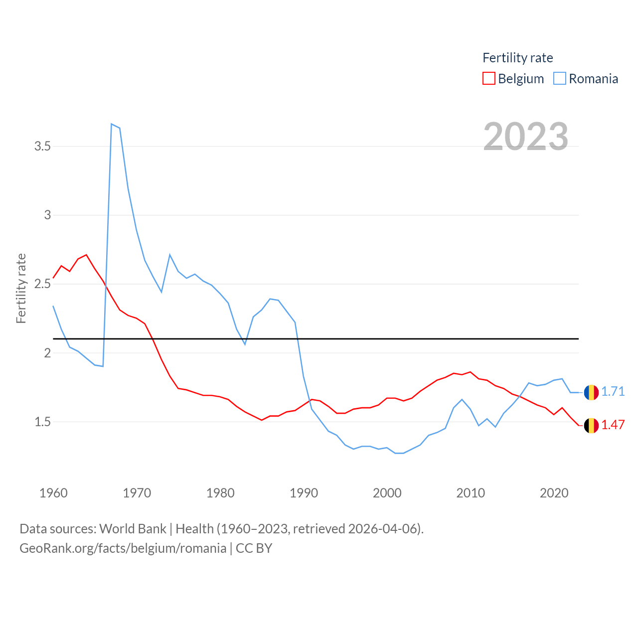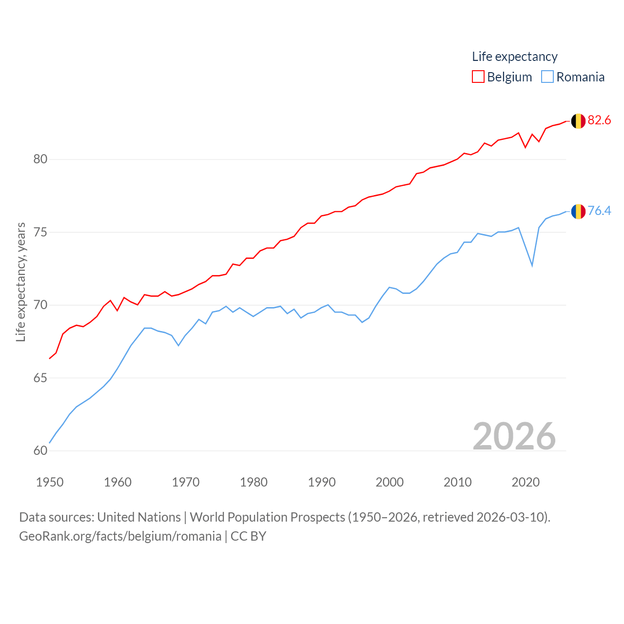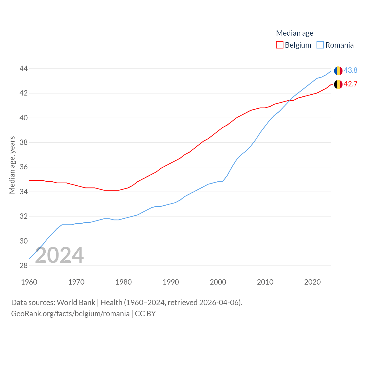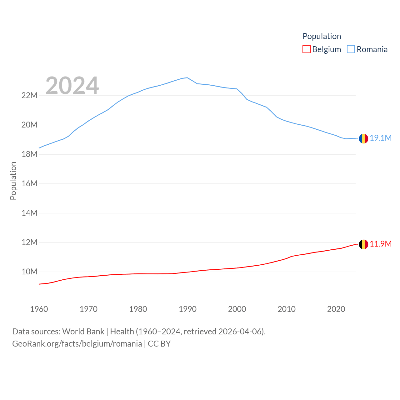 Belgium has a population of 11.9M (ranked 82/197), compared with 19.1M in Romania (ranked 67/197). Belgium's land area is 11,774 sq mi versus 88,834 sq mi for Romania (ranked 136th vs. 80th).