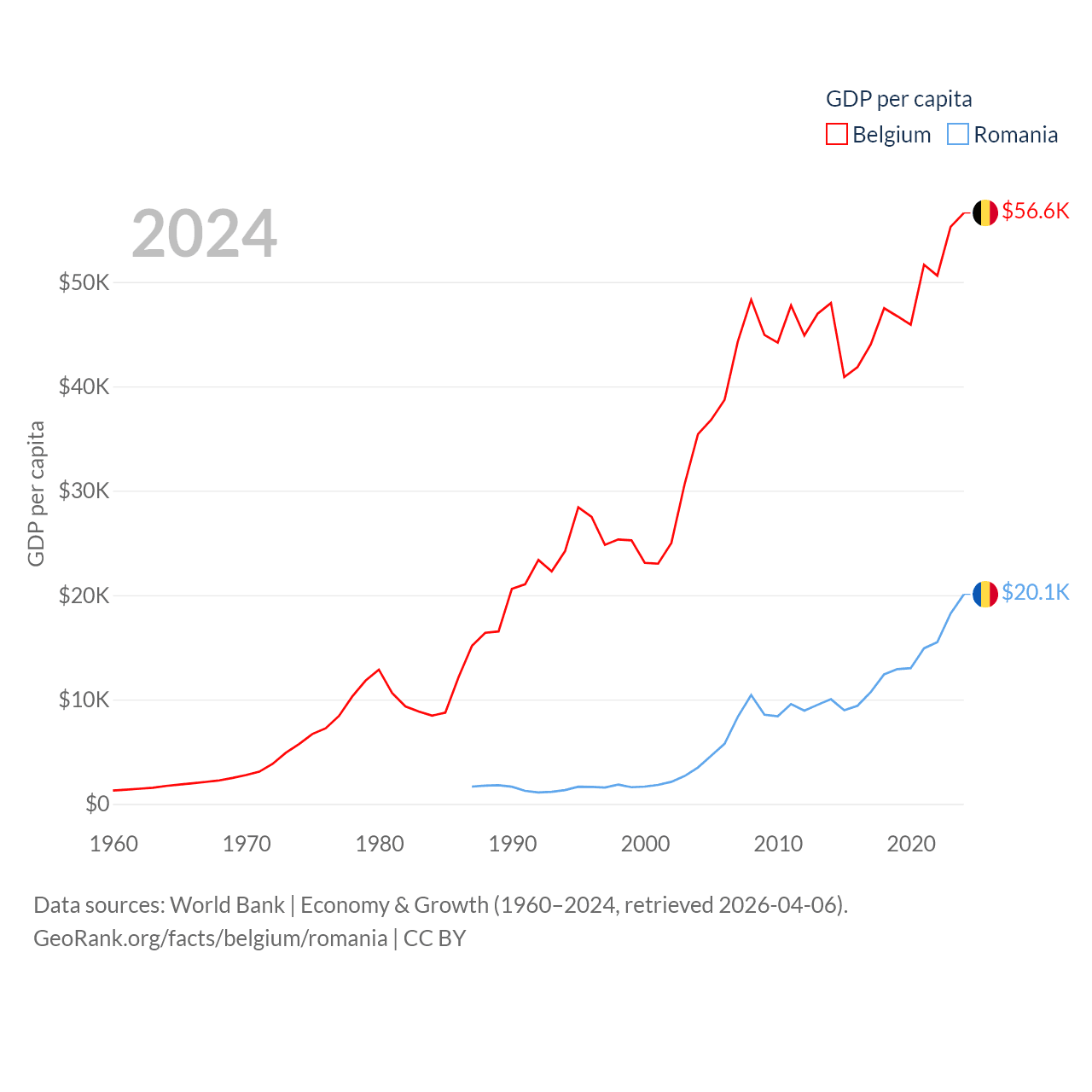 By GDP, Belgium ranks 23/197 ($671B) and Romania ranks 42/197 ($383B). By GDP per capita, Belgium ranks 18/197 ($56,615), while Romania ranks 58/197 ($20,080).