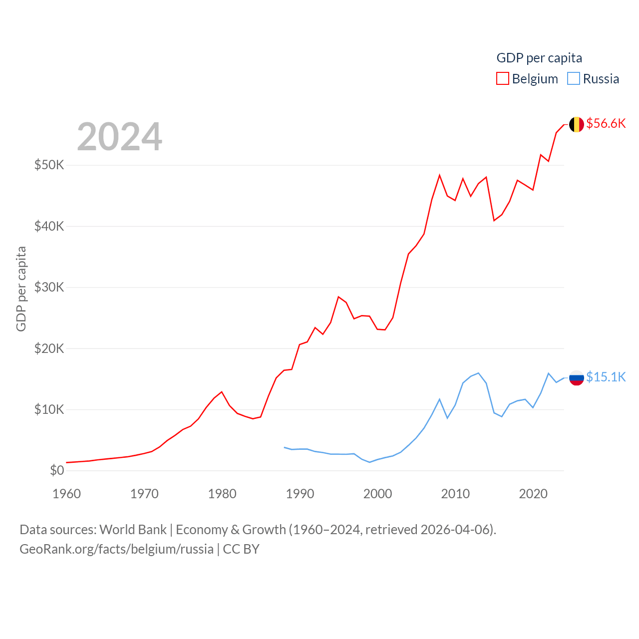 By GDP, Belgium ranks 23/197 ($671B) and Russia ranks 11/197 ($2.17T). By GDP per capita, Belgium ranks 18/197 ($56,615), while Russia ranks 68/197 ($15,145).