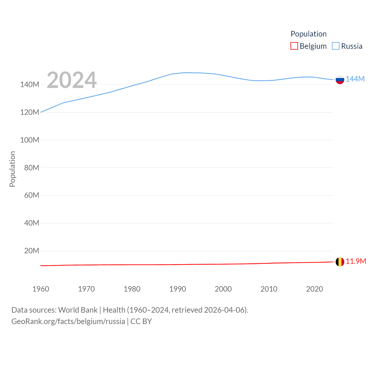 Belgium has a population of 11.9M (ranked 82/197), compared with 144M in Russia (ranked 9/197). Belgium's land area is 11,774 sq mi versus 6,323,145 sq mi for Russia (ranked 136th vs. 1st).