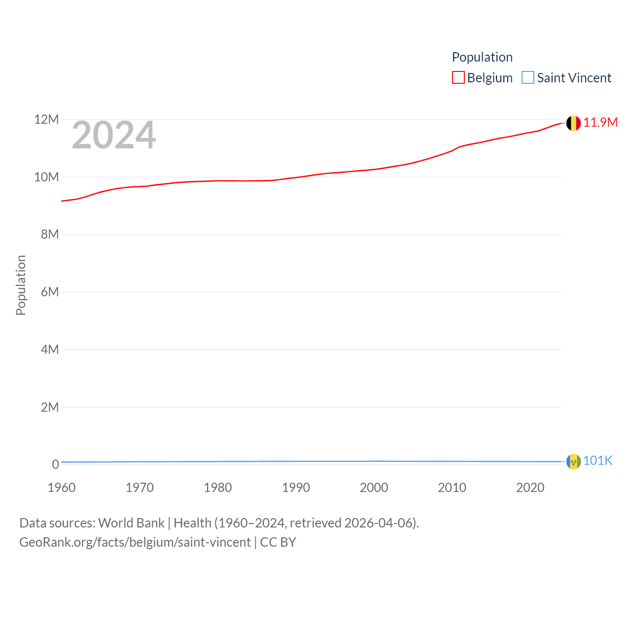 Belgium has a population of 11.9M (ranked 82/197), compared with 101K in Saint Vincent (ranked 184/197). Belgium's land area is 11,774 sq mi versus 150.6 sq mi for Saint Vincent (ranked 136th vs. 185th).