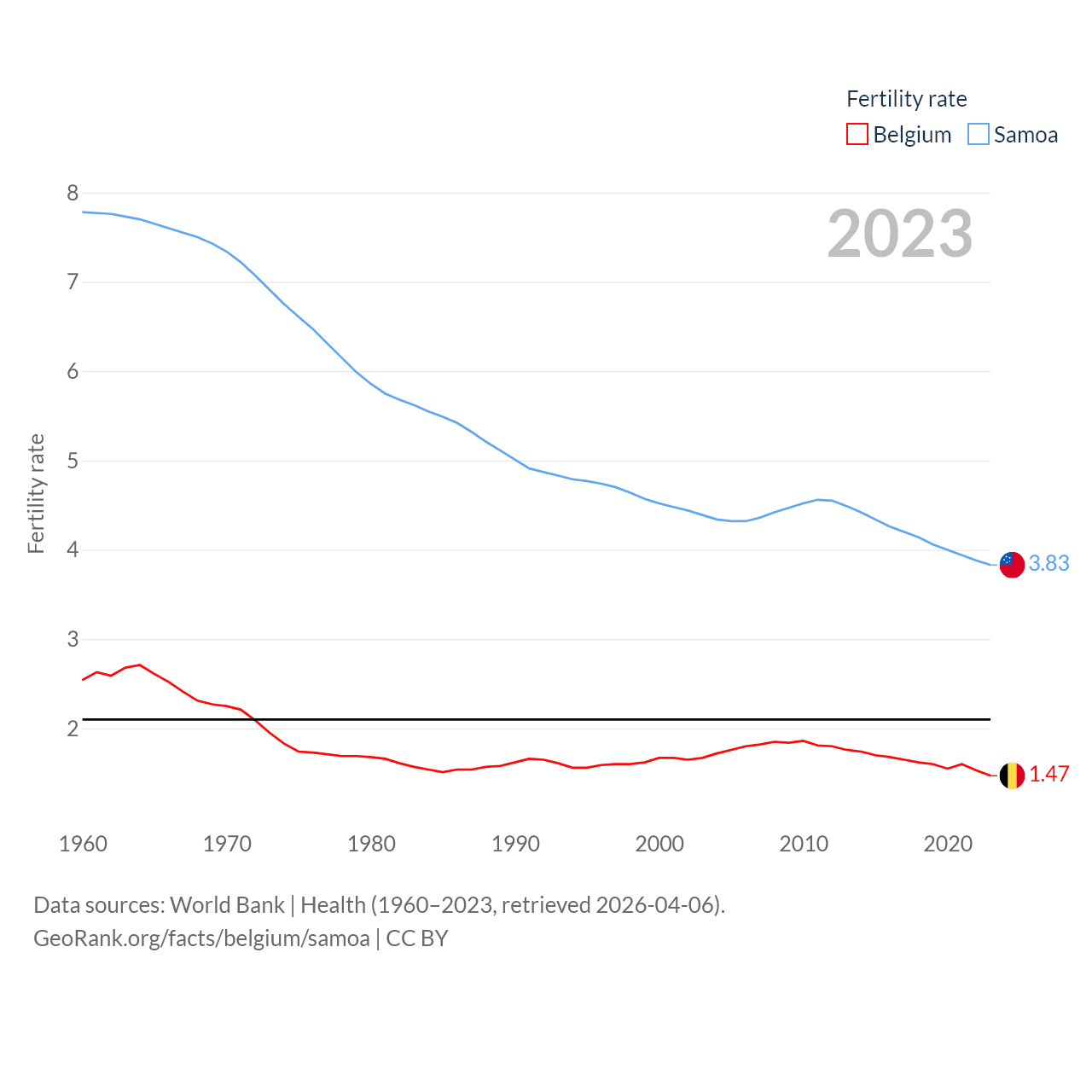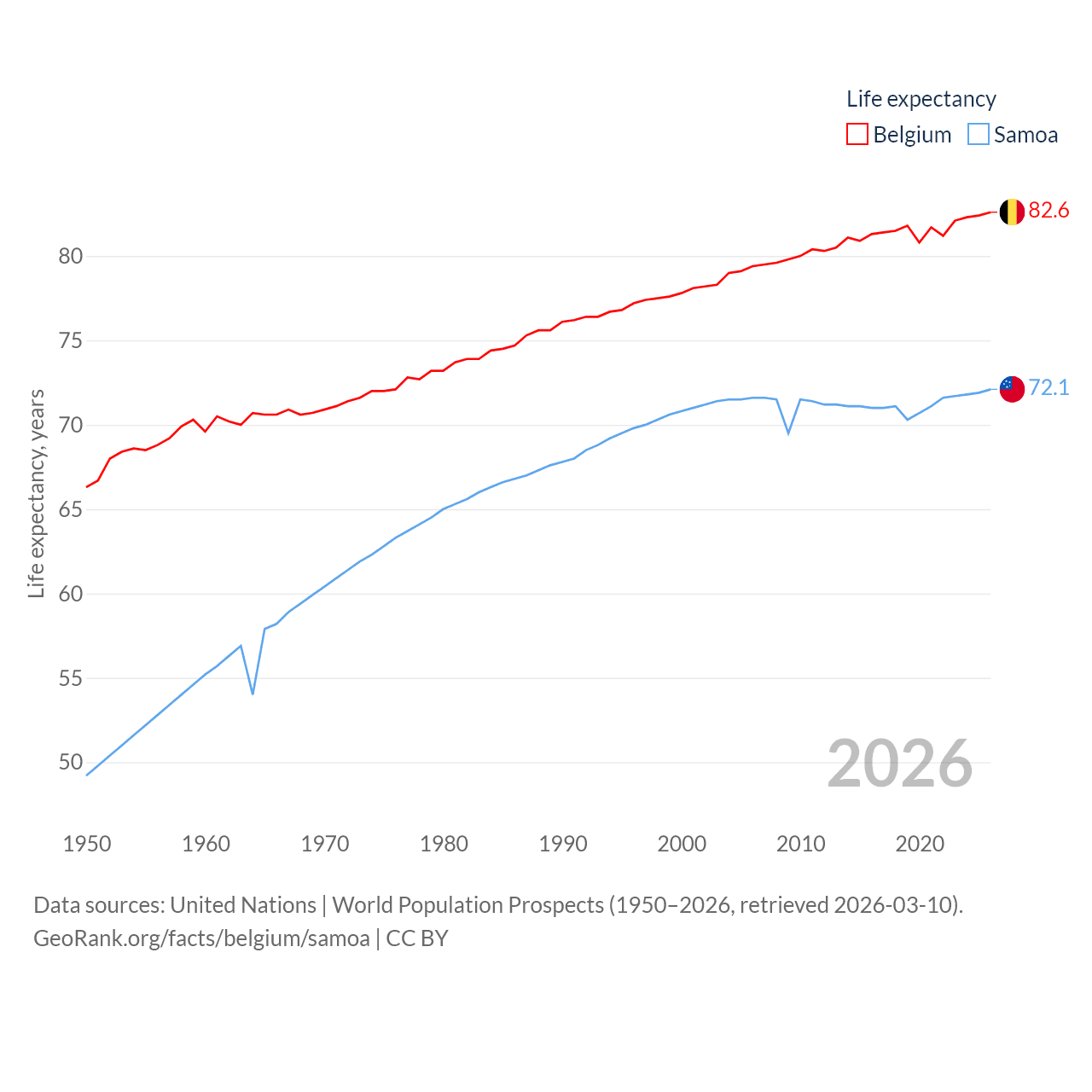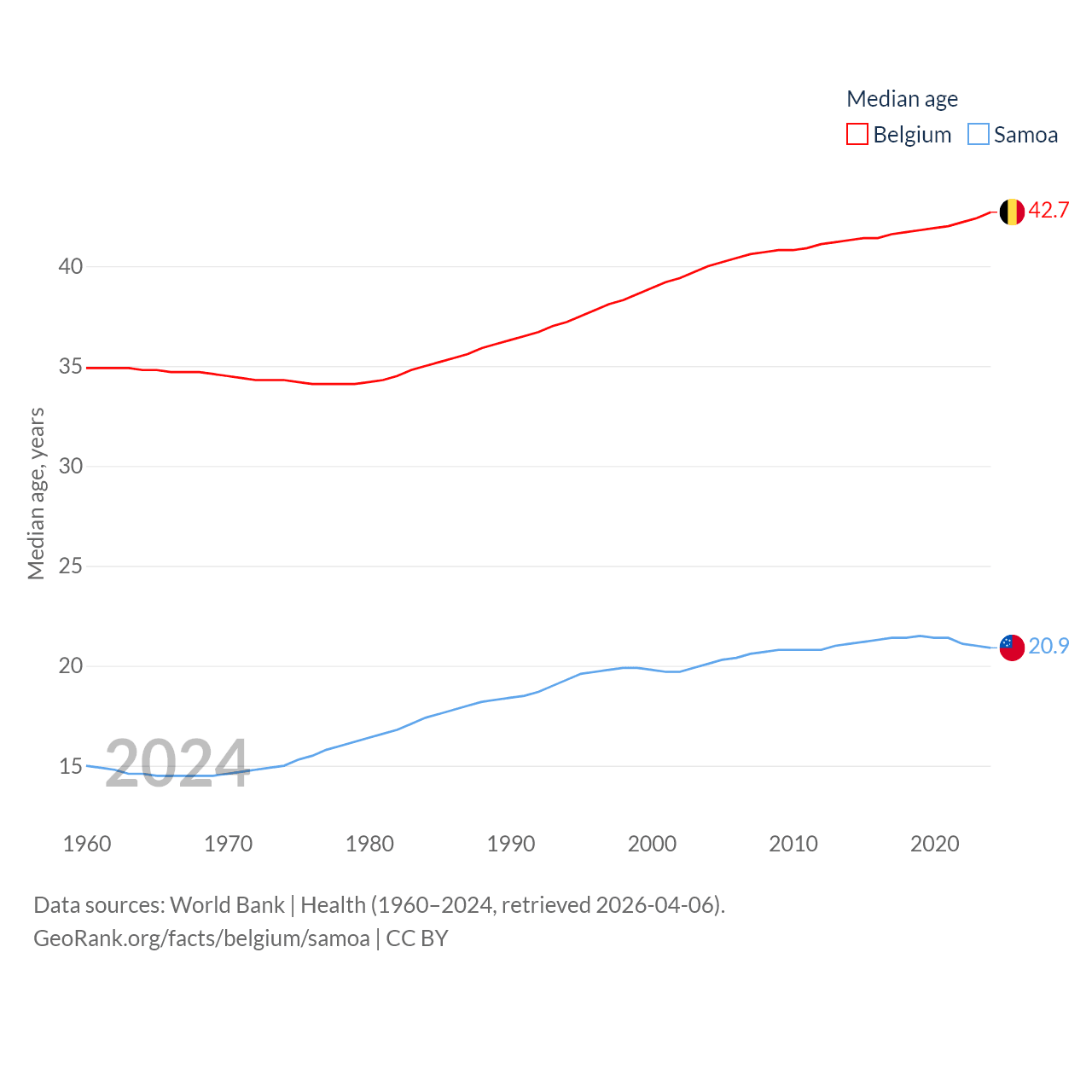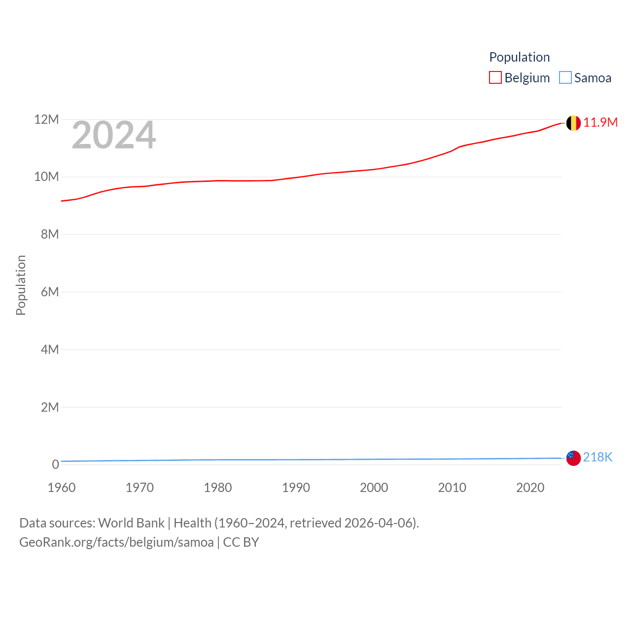 Belgium has a population of 11.9M (ranked 82/197), compared with 218K in Samoa (ranked 177/197). Belgium's land area is 11,774 sq mi versus 1,073 sq mi for Samoa (ranked 136th vs. 168th).