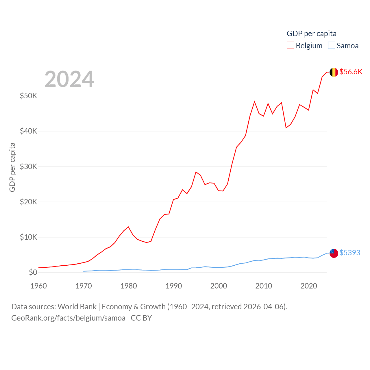 By GDP, Belgium ranks 23/197 ($671B) and Samoa ranks 185/197 ($1.18B). By GDP per capita, Belgium ranks 18/197 ($56,615), while Samoa ranks 117/197 ($5,393).