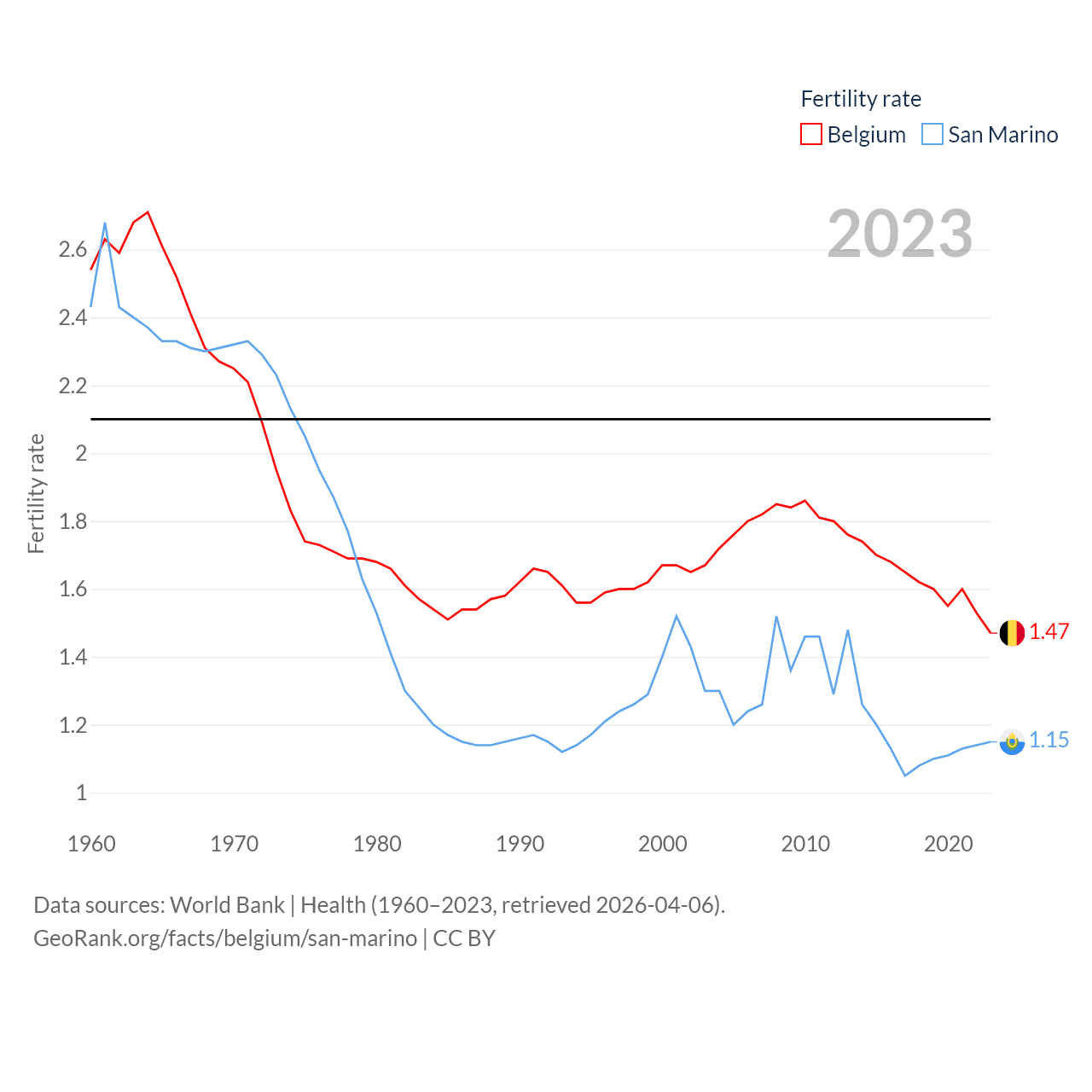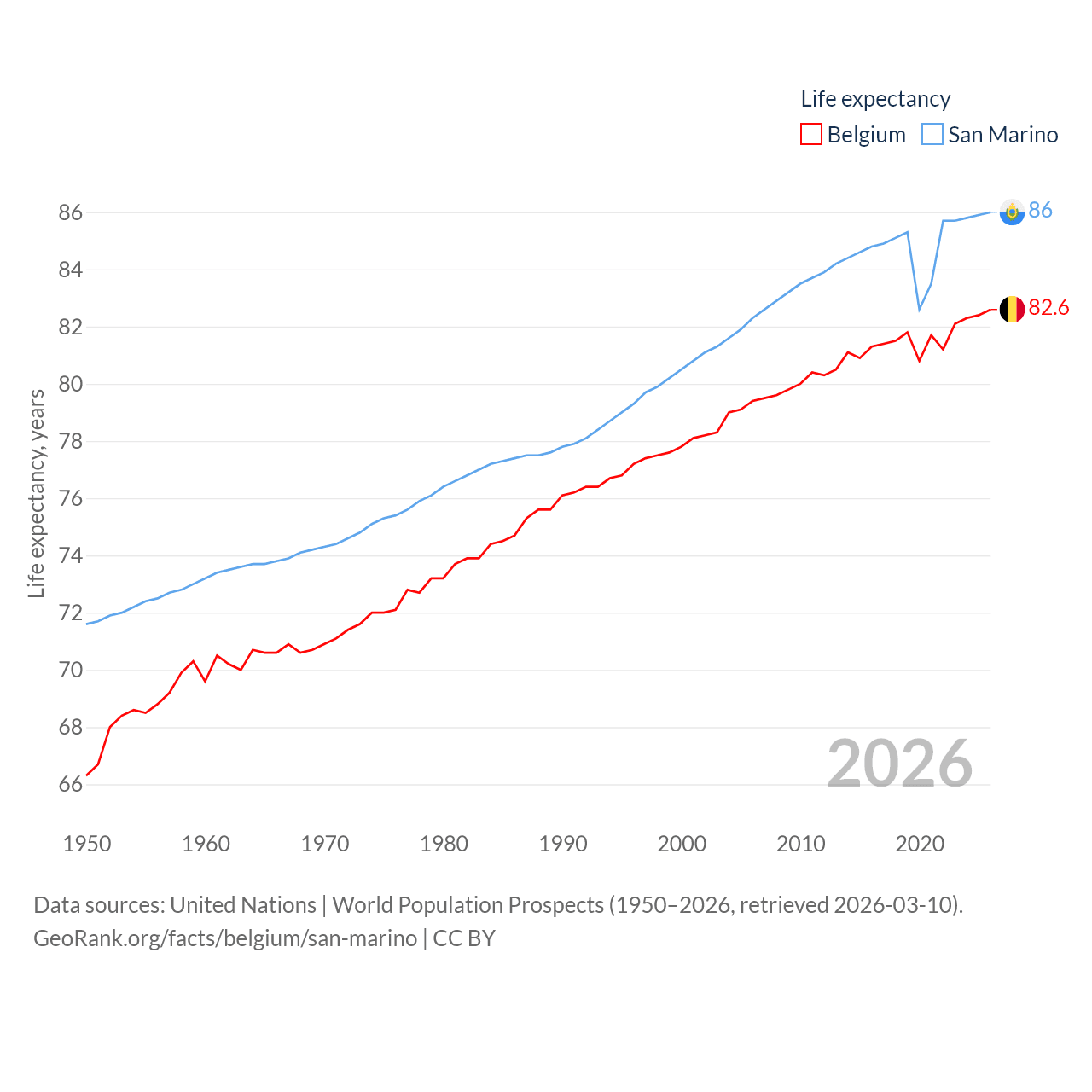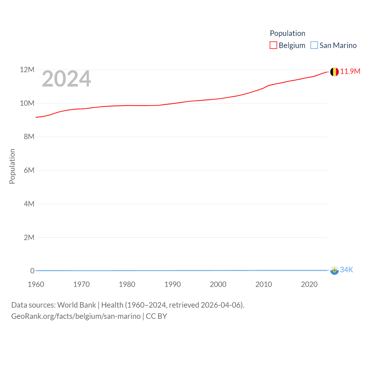 Belgium has a population of 11.9M (ranked 82/197), compared with 34K in San Marino (ranked 193/197). Belgium's land area is 11,774 sq mi versus 23.2 sq mi for San Marino (ranked 136th vs. 193rd).