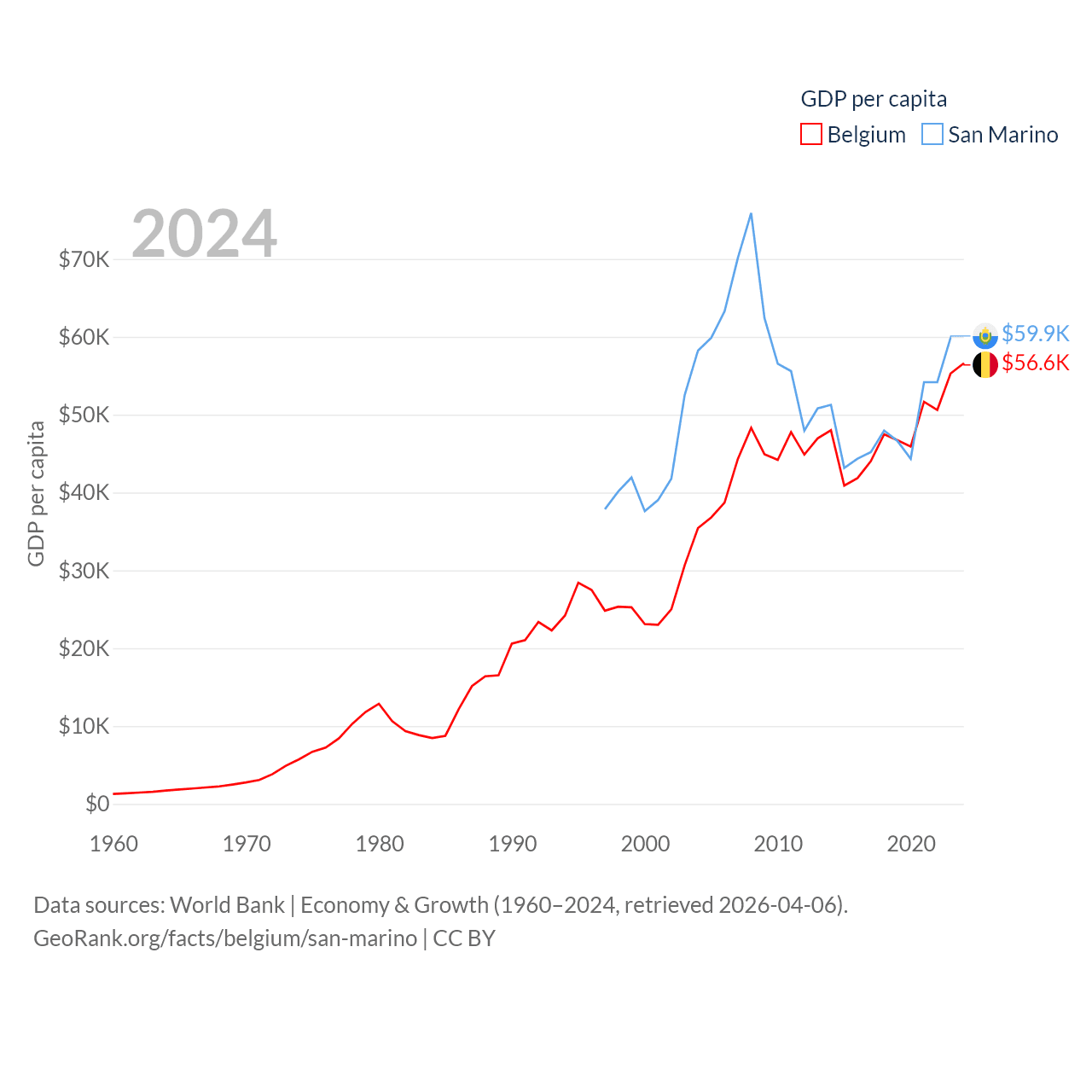 By GDP, Belgium ranks 23/197 ($671B) and San Marino ranks 180/197 ($2.03B). By GDP per capita, Belgium ranks 18/197 ($56,615), while San Marino ranks 15/197 ($59,880).
