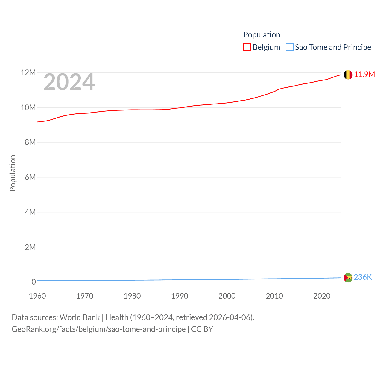 Belgium has a population of 11.9M (ranked 82/197), compared with 236K in Sao Tome and Principe (ranked 176/197). Belgium's land area is 11,774 sq mi versus 371 sq mi for Sao Tome and Principe (ranked 136th vs. 172nd).