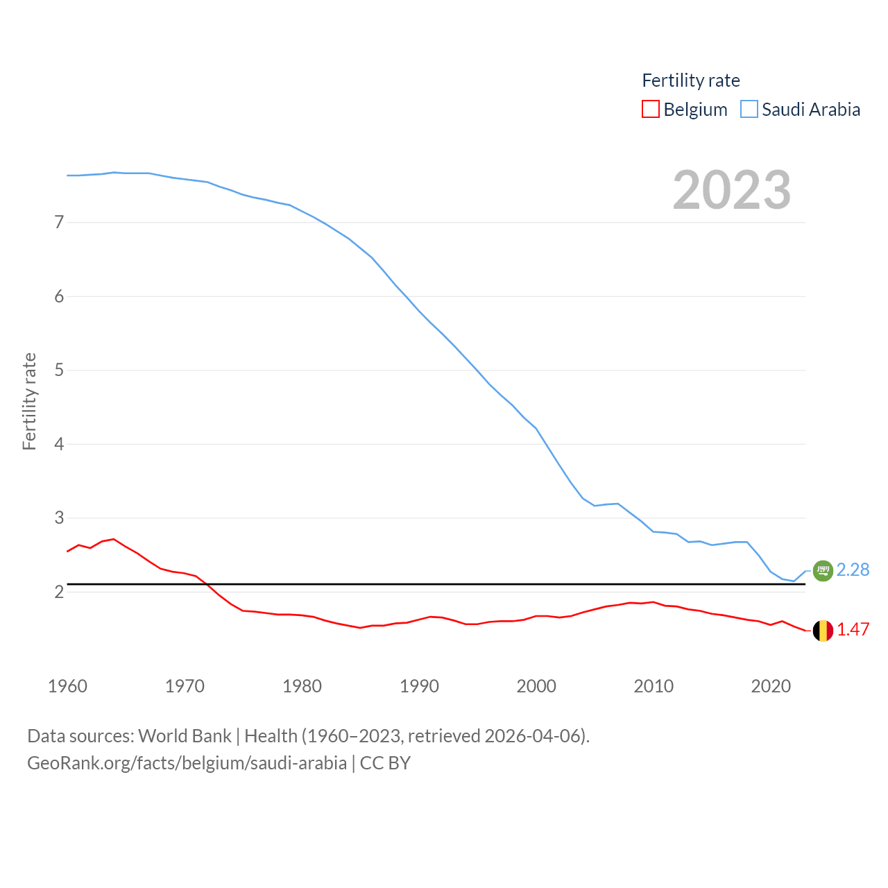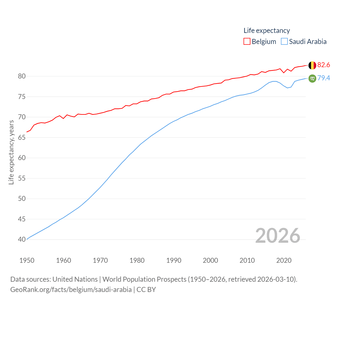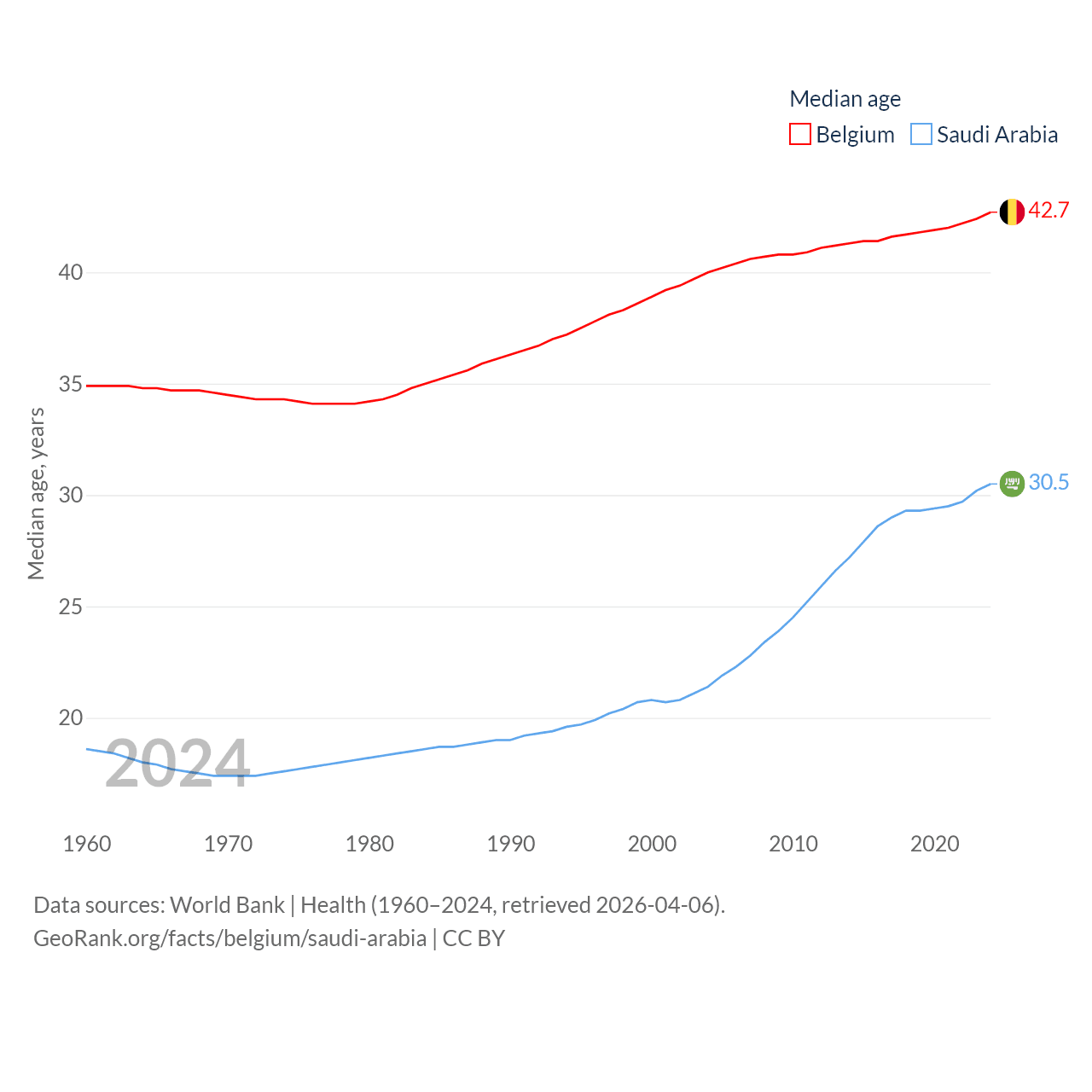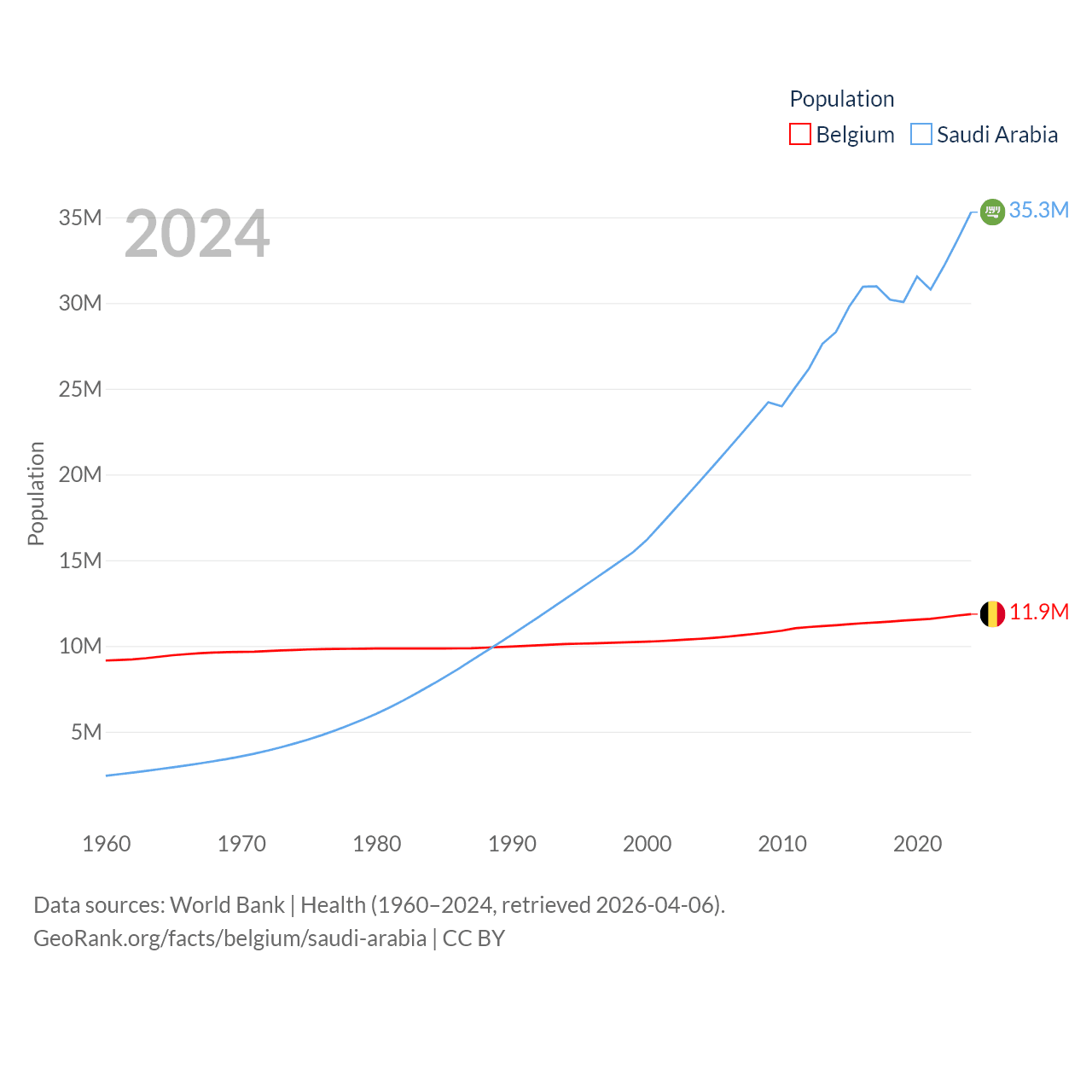 Belgium has a population of 11.9M (ranked 82/197), compared with 35.3M in Saudi Arabia (ranked 45/197). Belgium's land area is 11,774 sq mi versus 830,000 sq mi for Saudi Arabia (ranked 136th vs. 12th).
