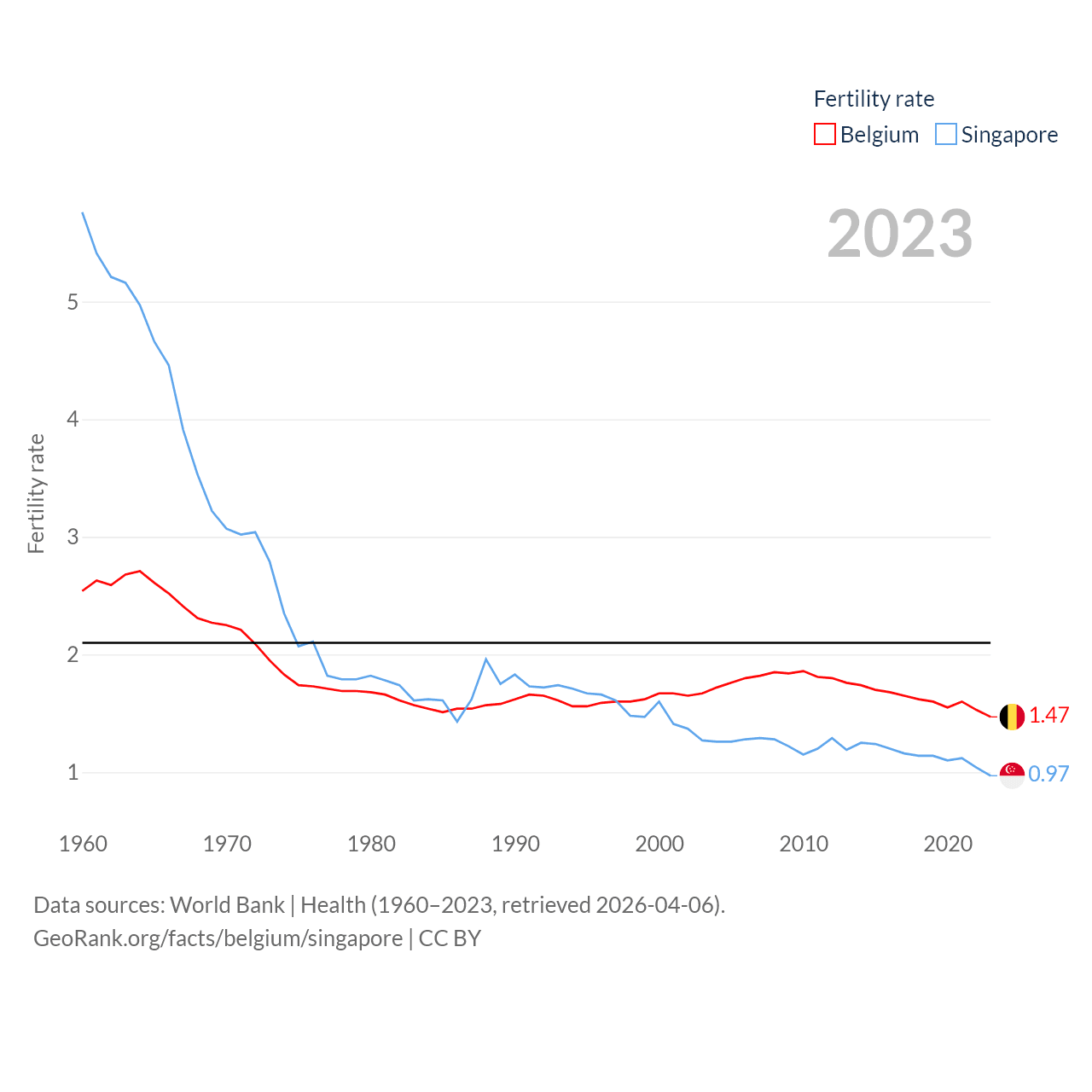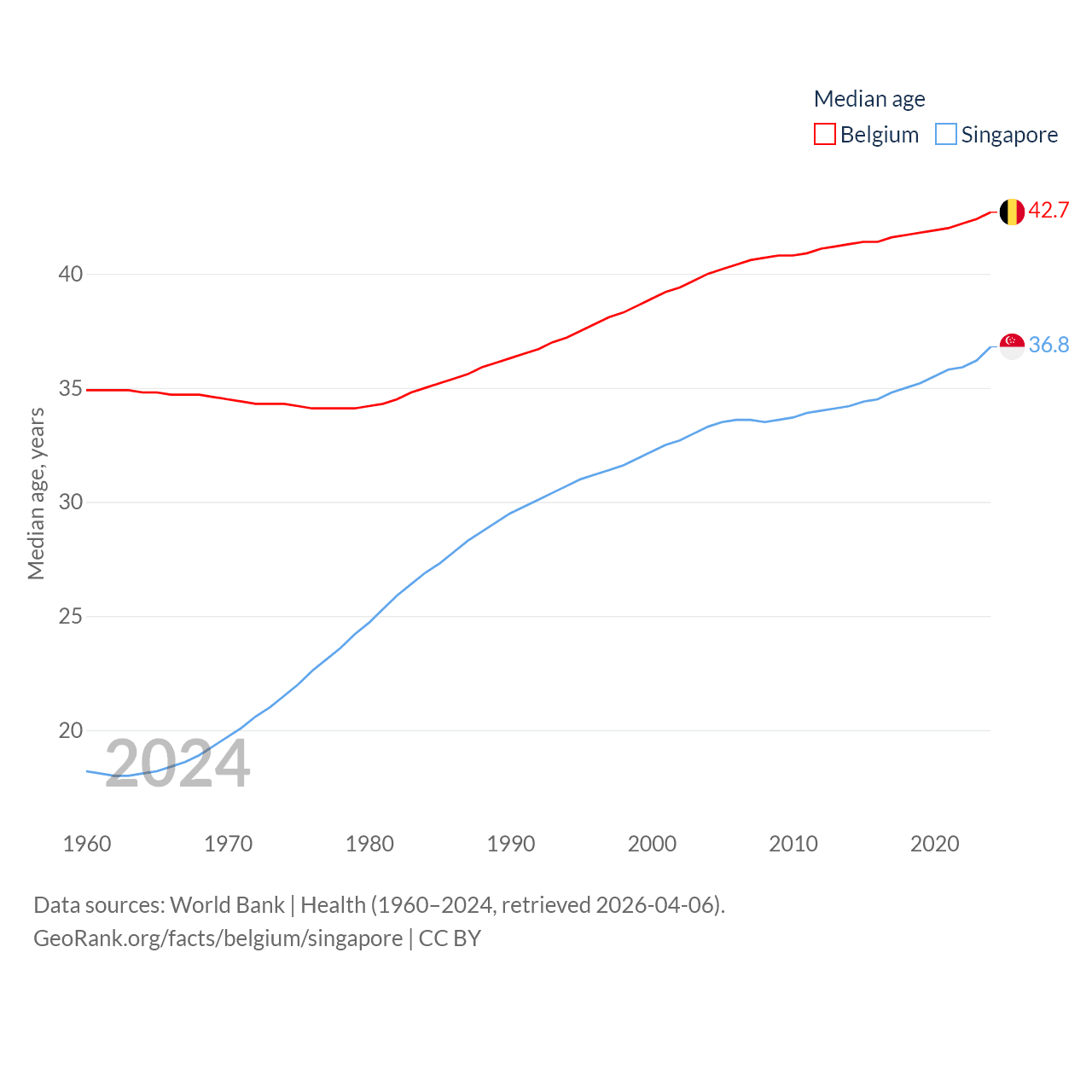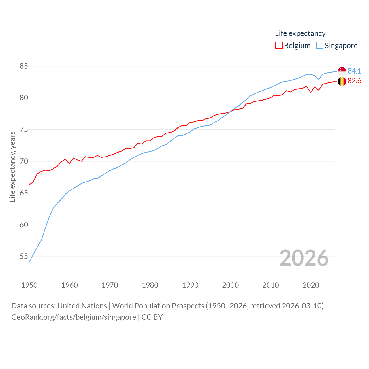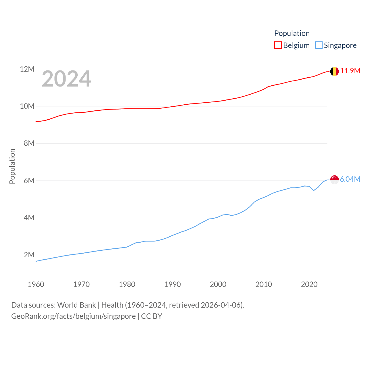 Belgium has a population of 11.9M (ranked 82/197), compared with 6.04M in Singapore (ranked 113/197). Belgium's land area is 11,774 sq mi versus 277.2 sq mi for Singapore (ranked 136th vs. 177th).