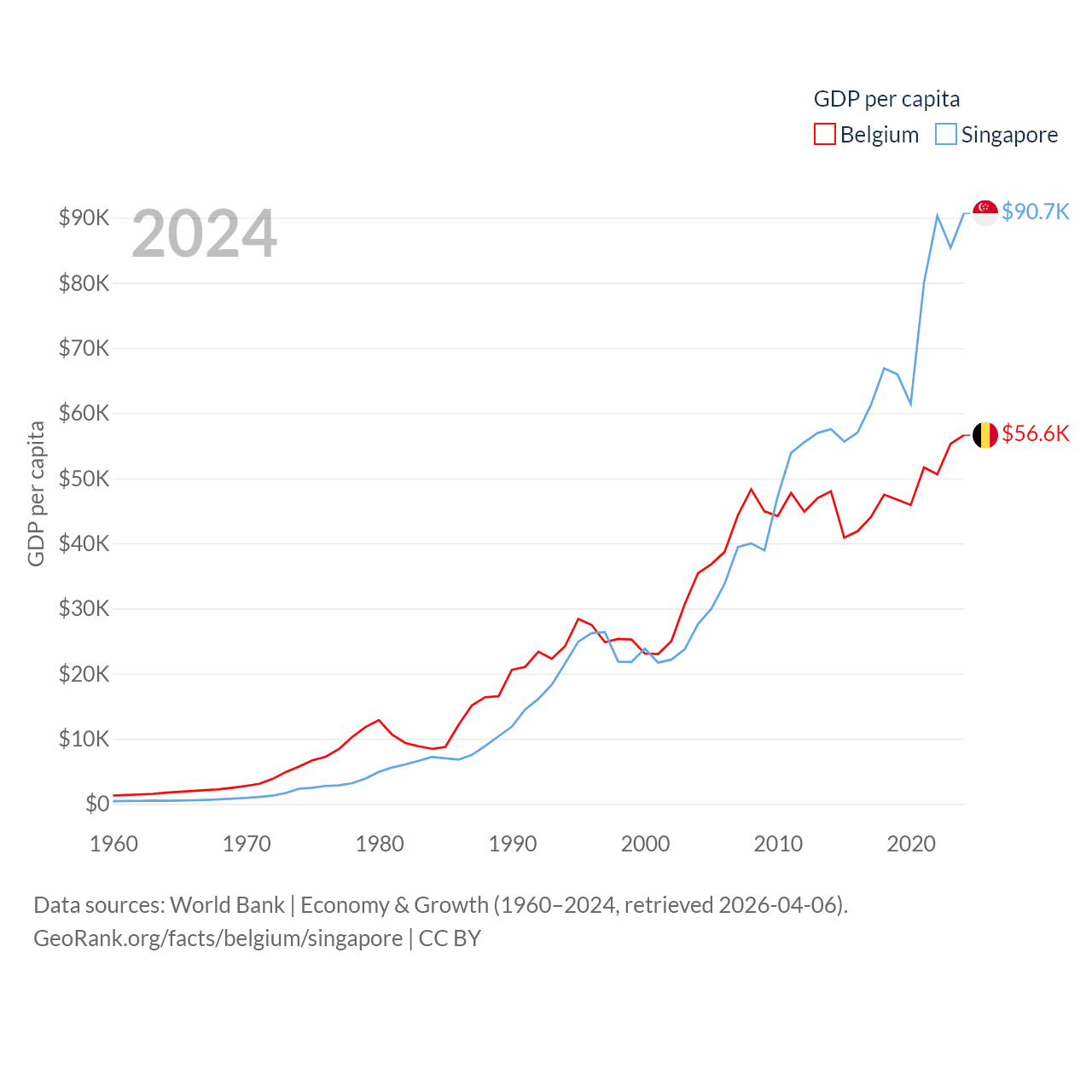 By GDP, Belgium ranks 23/197 ($671B) and Singapore ranks 28/197 ($547B). By GDP per capita, Belgium ranks 18/197 ($56,615), while Singapore ranks 7/197 ($90,674).