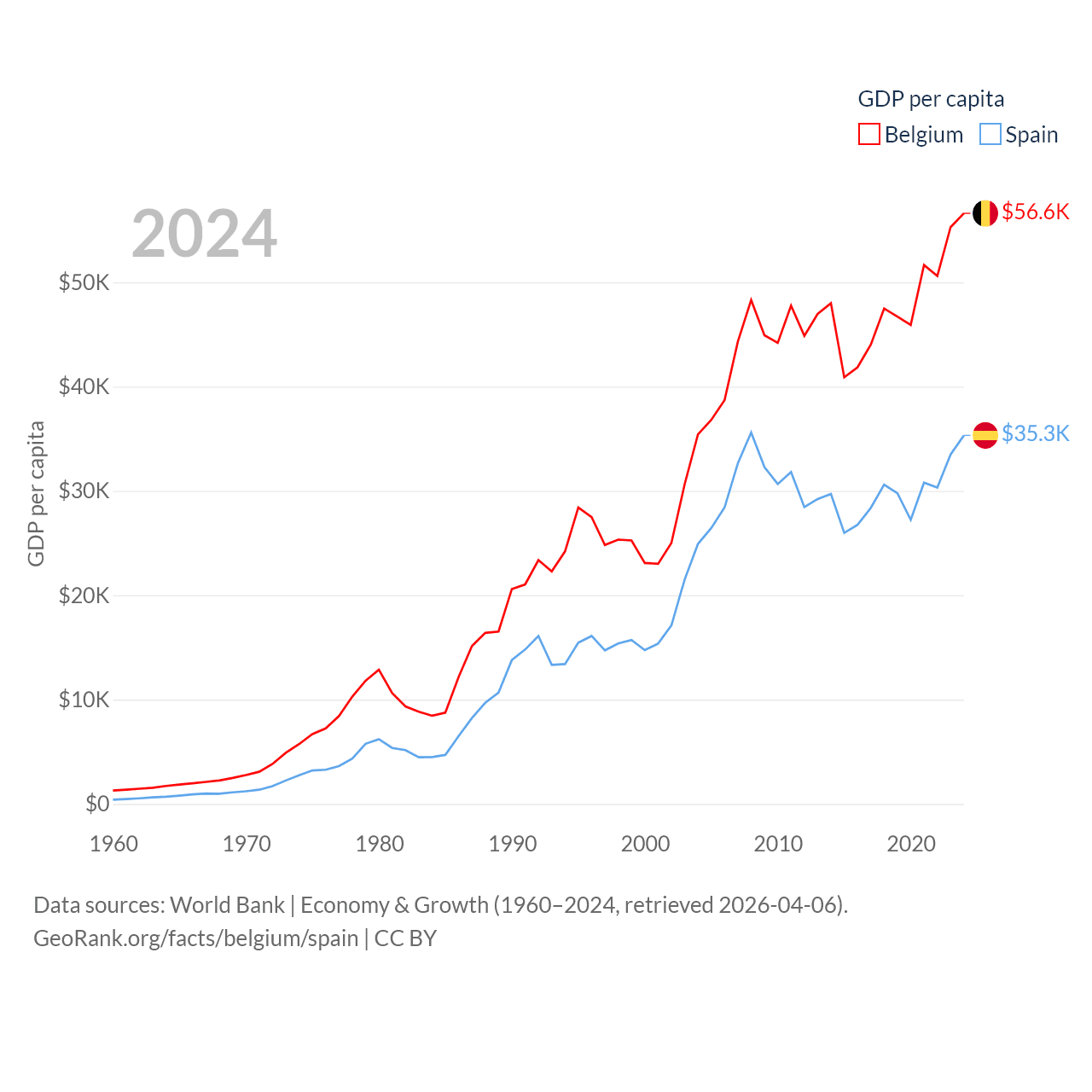 By GDP, Belgium ranks 23/197 ($671B) and Spain ranks 15/197 ($1.73T). By GDP per capita, Belgium ranks 18/197 ($56,615), while Spain ranks 32/197 ($35,327).
