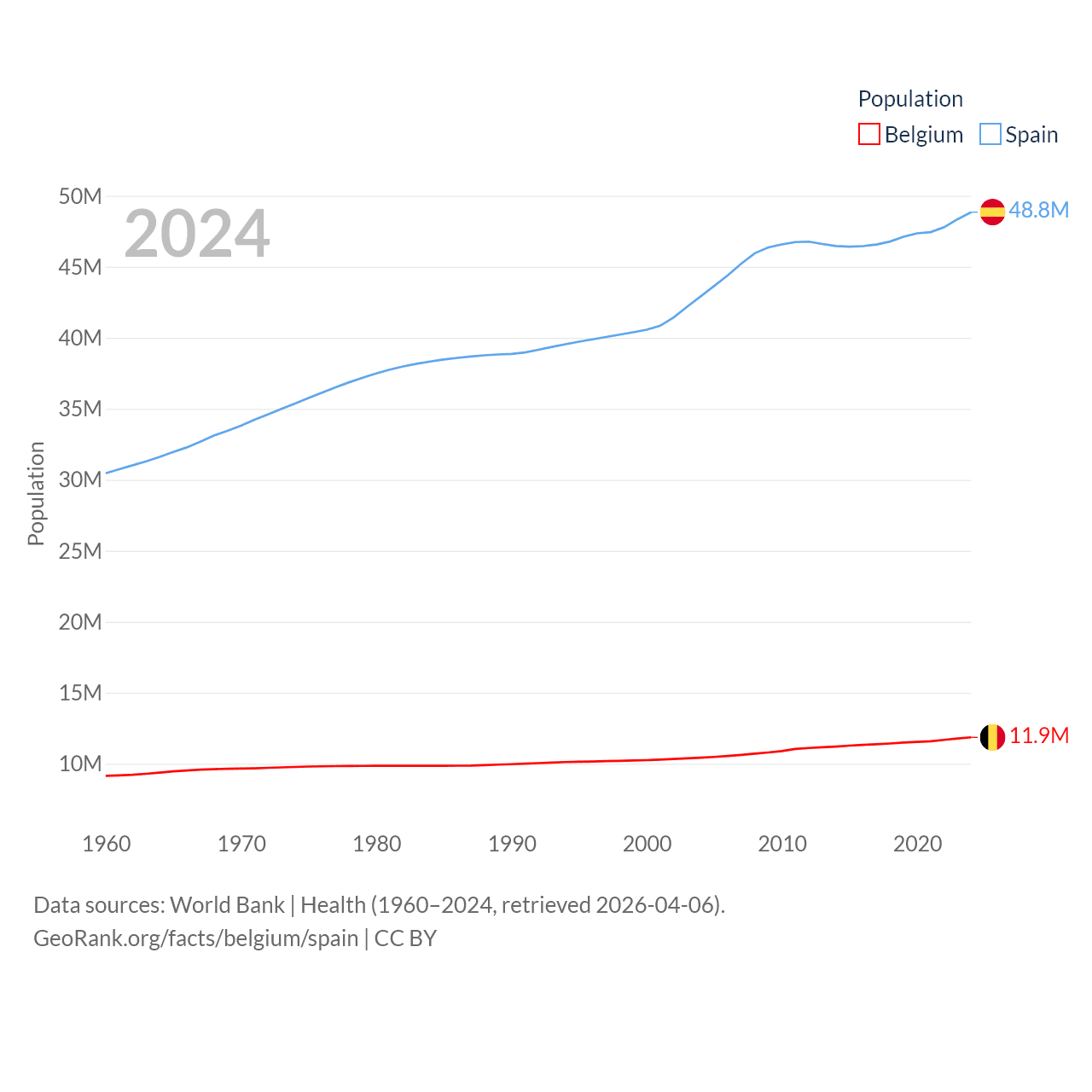 Belgium has a population of 11.9M (ranked 82/197), compared with 48.8M in Spain (ranked 32/197). Belgium's land area is 11,774 sq mi versus 192,934 sq mi for Spain (ranked 136th vs. 51st).