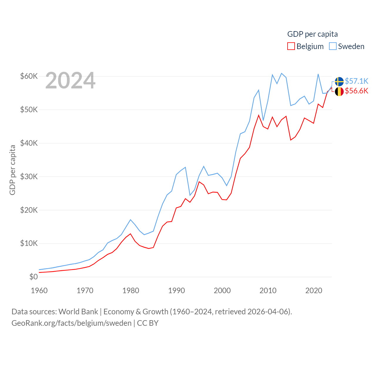 By GDP, Belgium ranks 23/197 ($671B) and Sweden ranks 26/197 ($604B). By GDP per capita, Belgium ranks 18/197 ($56,615), while Sweden ranks 17/197 ($57,117).