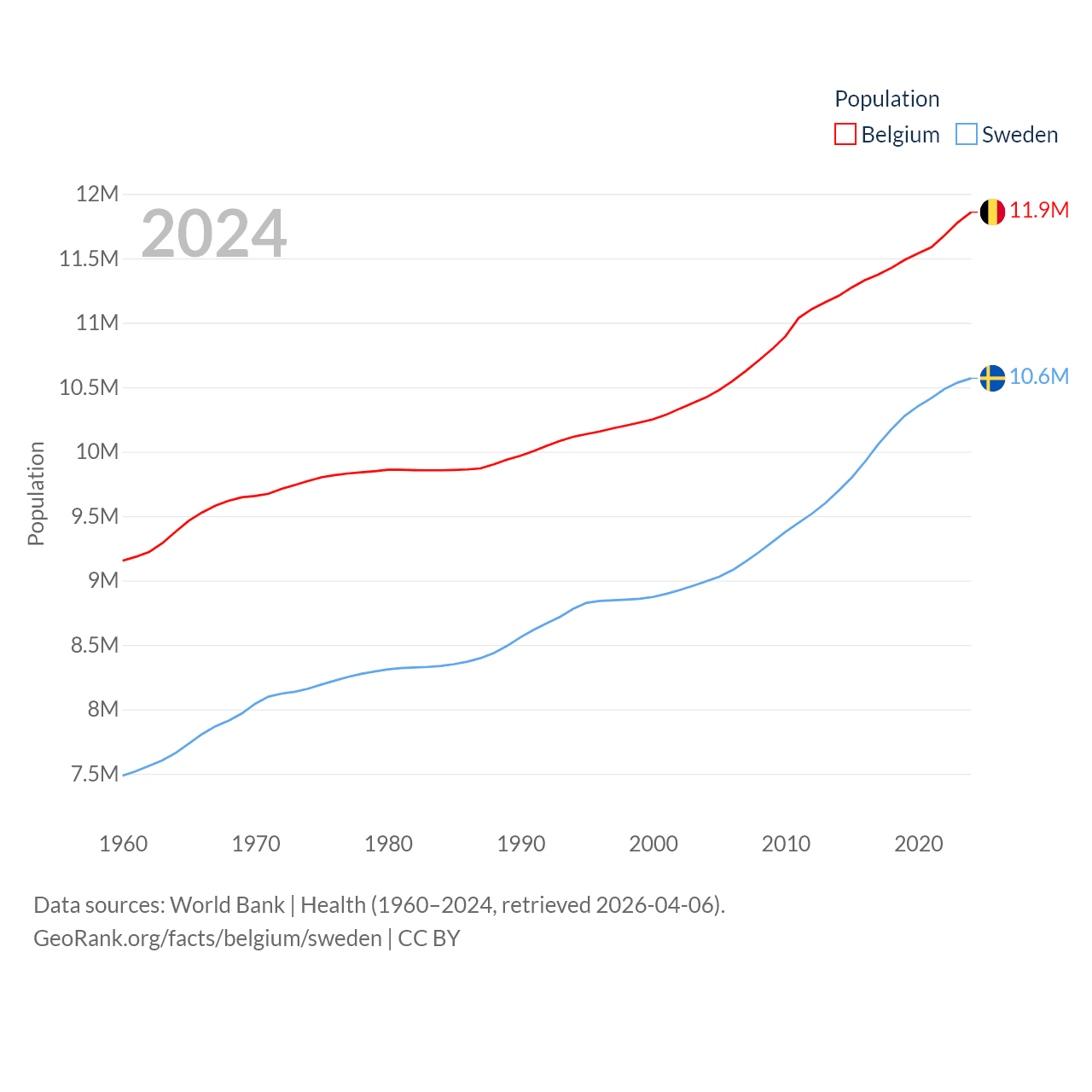 Belgium has a population of 11.9M (ranked 82/197), compared with 10.6M in Sweden (ranked 93/197). Belgium's land area is 11,774 sq mi versus 157,248 sq mi for Sweden (ranked 136th vs. 58th).