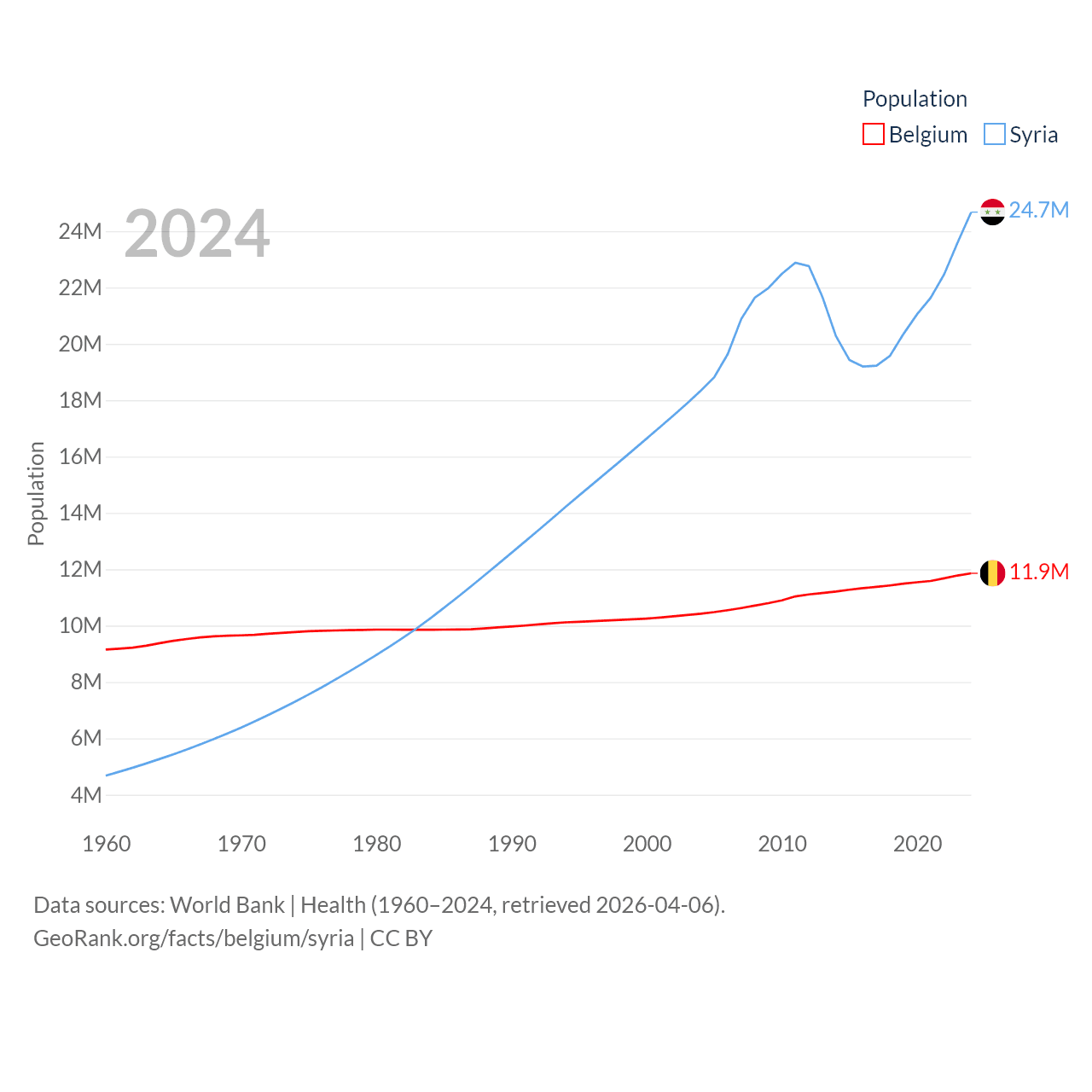 Belgium has a population of 11.9M (ranked 82/197), compared with 24.7M in Syria (ranked 57/197). Belgium's land area is 11,774 sq mi versus 70,900 sq mi for Syria (ranked 136th vs. 87th).