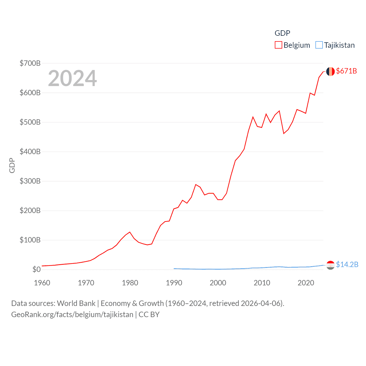 By GDP, Belgium ranks 23/197 ($671B) and Tajikistan ranks 145/197 ($14.2B). By GDP per capita, Belgium ranks 18/197 ($56,615), while Tajikistan ranks 166/197 ($1,341).