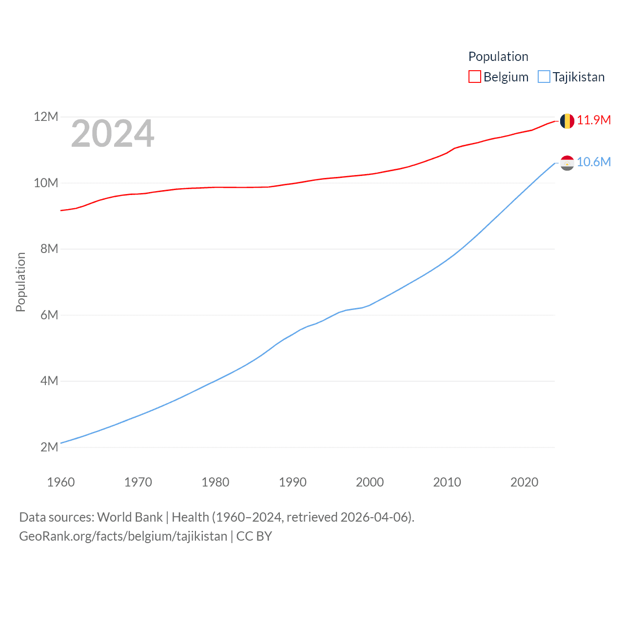 Belgium has a population of 11.9M (ranked 82/197), compared with 10.6M in Tajikistan (ranked 91/197). Belgium's land area is 11,774 sq mi versus 53,587 sq mi for Tajikistan (ranked 136th vs. 93rd).
