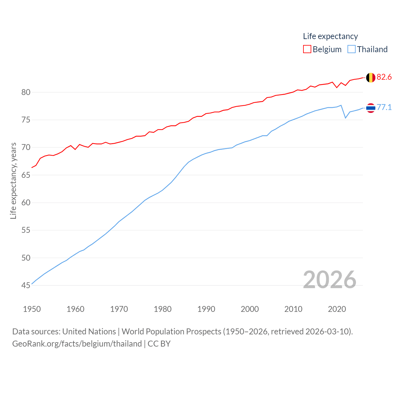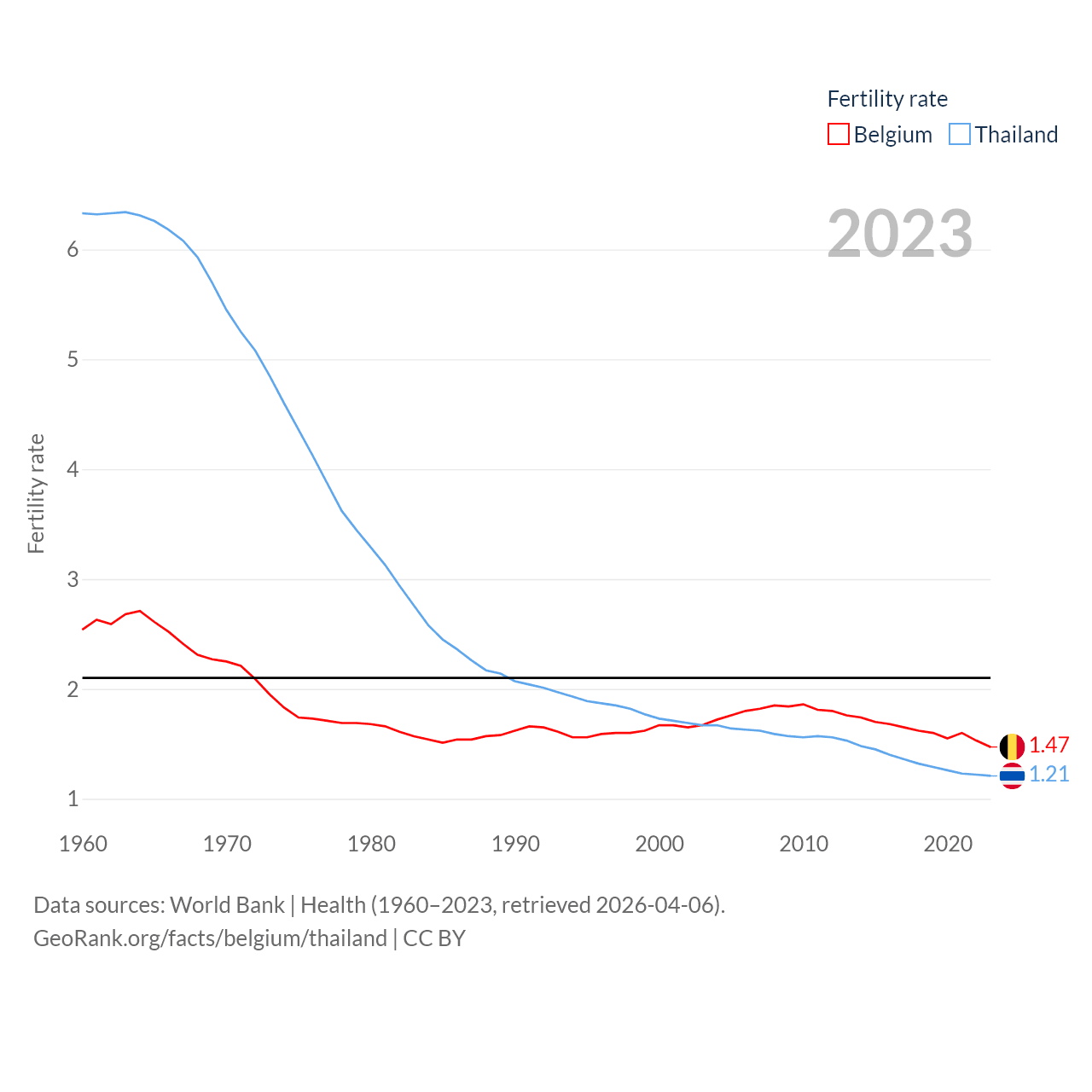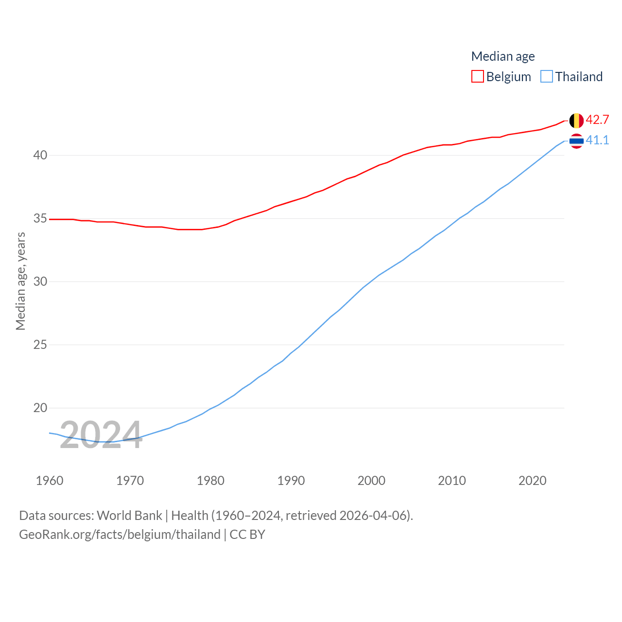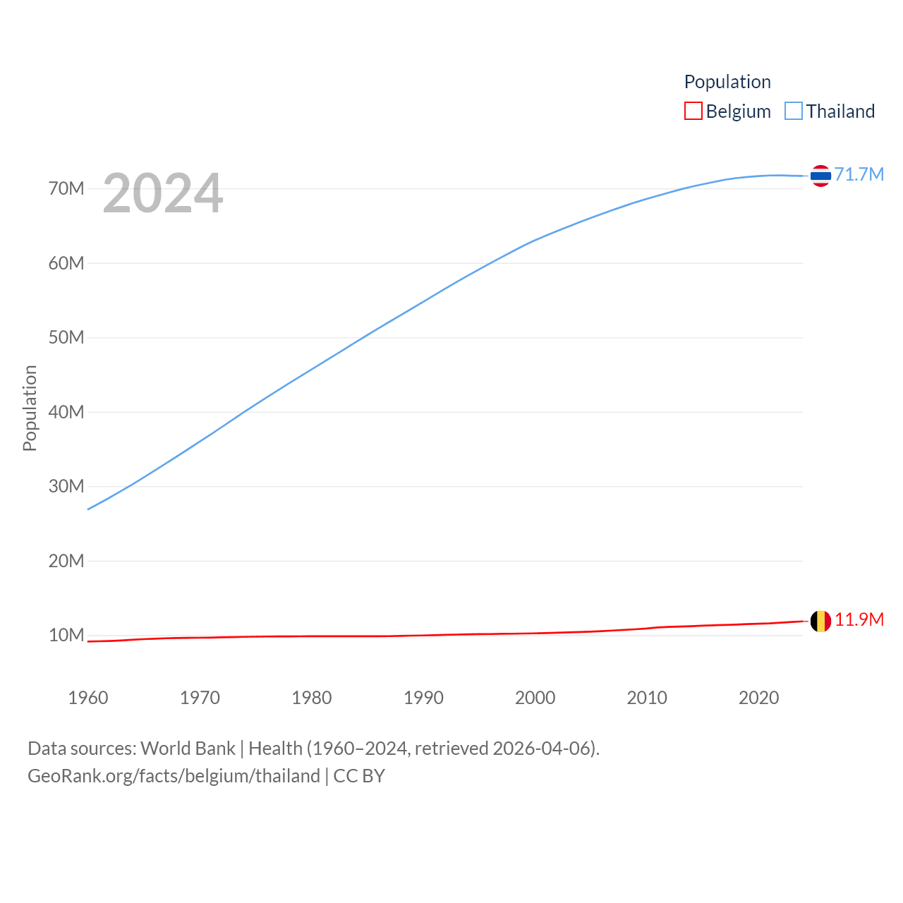 Belgium has a population of 11.9M (ranked 82/197), compared with 71.7M in Thailand (ranked 20/197). Belgium's land area is 11,774 sq mi versus 197,256 sq mi for Thailand (ranked 136th vs. 50th).