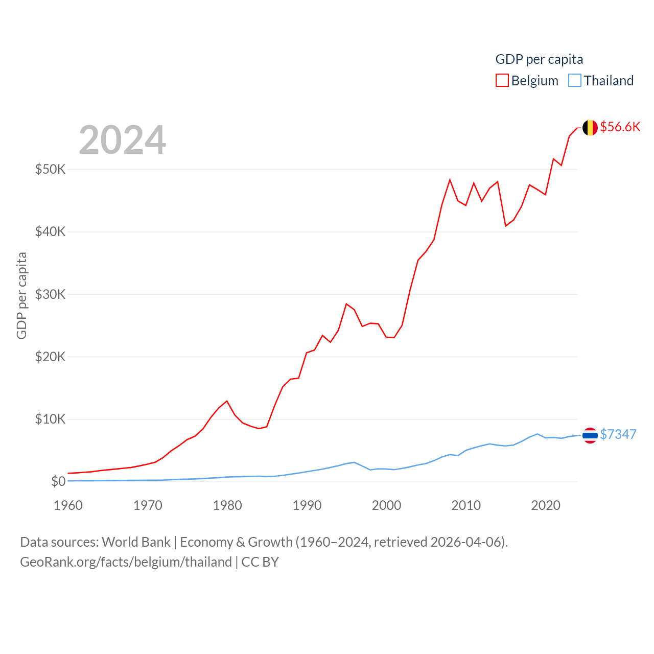 By GDP, Belgium ranks 23/197 ($671B) and Thailand ranks 31/197 ($527B). By GDP per capita, Belgium ranks 18/197 ($56,615), while Thailand ranks 100/197 ($7,347).