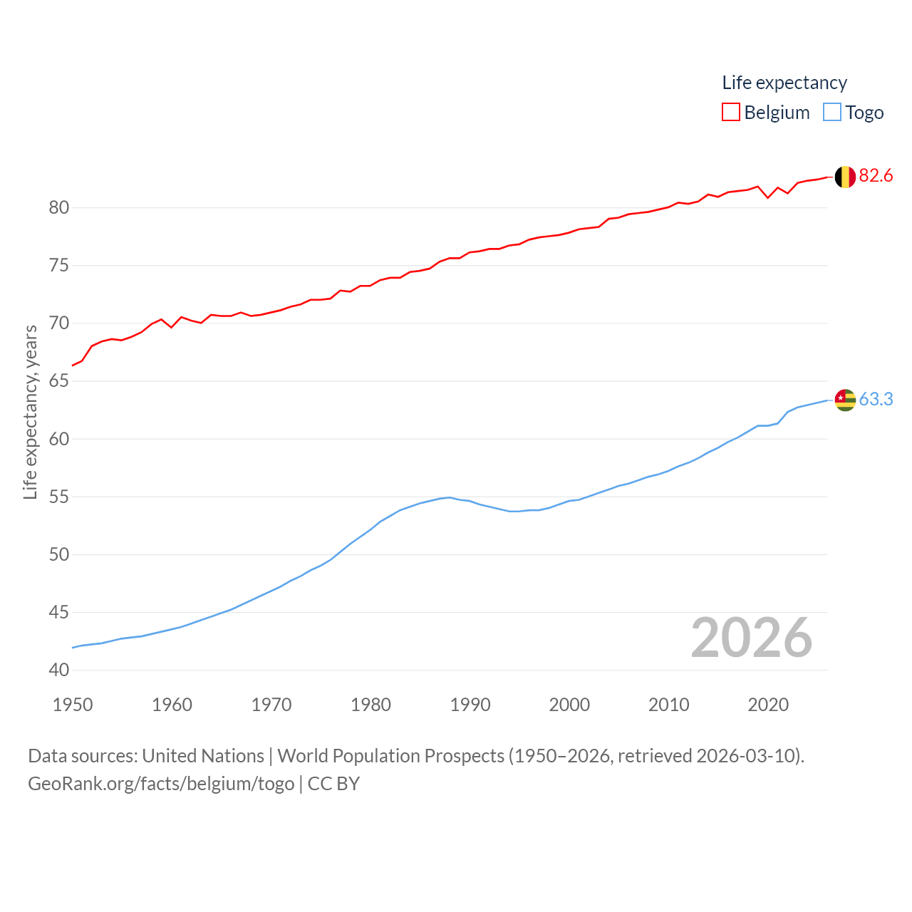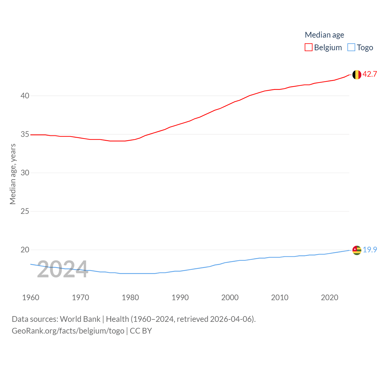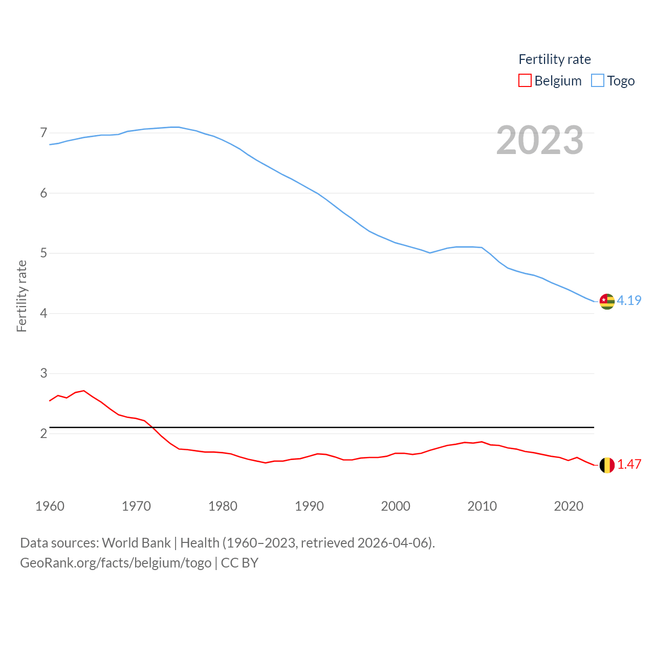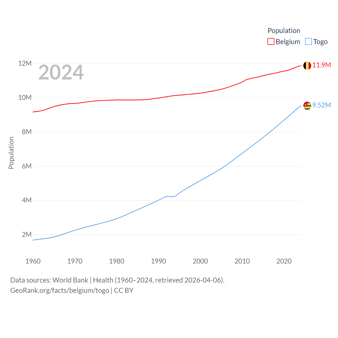 Belgium has a population of 11.9M (ranked 82/197), compared with 9.52M in Togo (ranked 98/197). Belgium's land area is 11,774 sq mi versus 21,000 sq mi for Togo (ranked 136th vs. 124th).