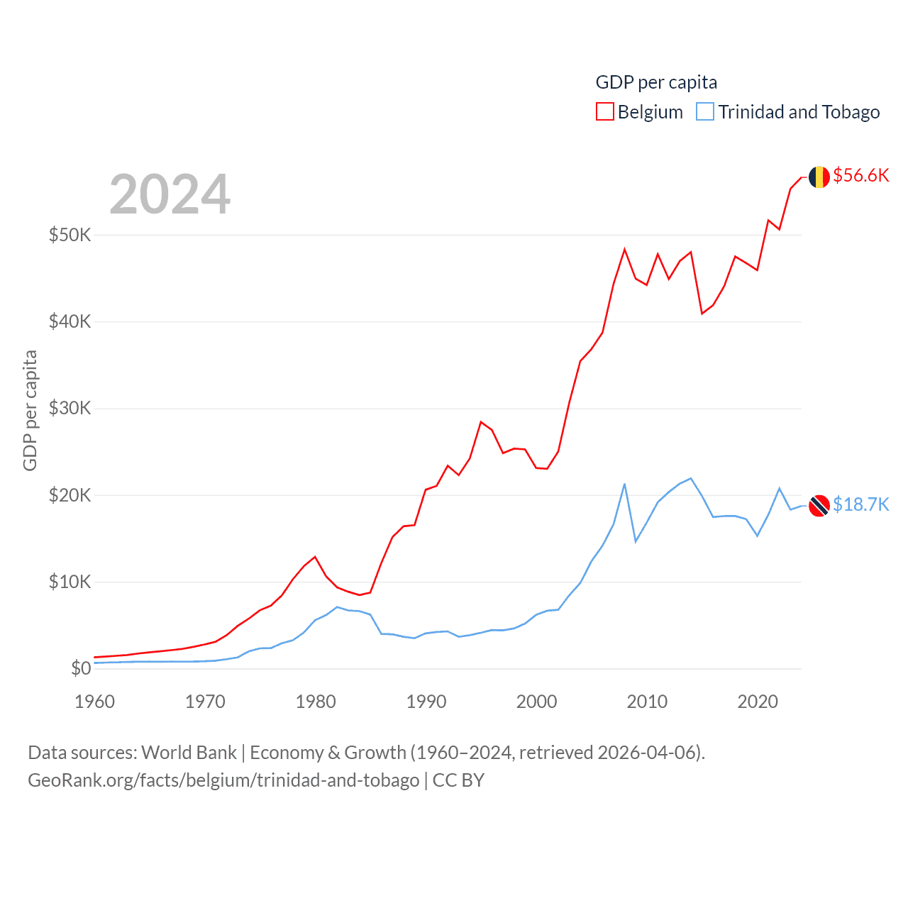 By GDP, Belgium ranks 23/197 ($671B) and Trinidad and Tobago ranks 115/197 ($25.6B). By GDP per capita, Belgium ranks 18/197 ($56,615), while Trinidad and Tobago ranks 61/197 ($18,733).