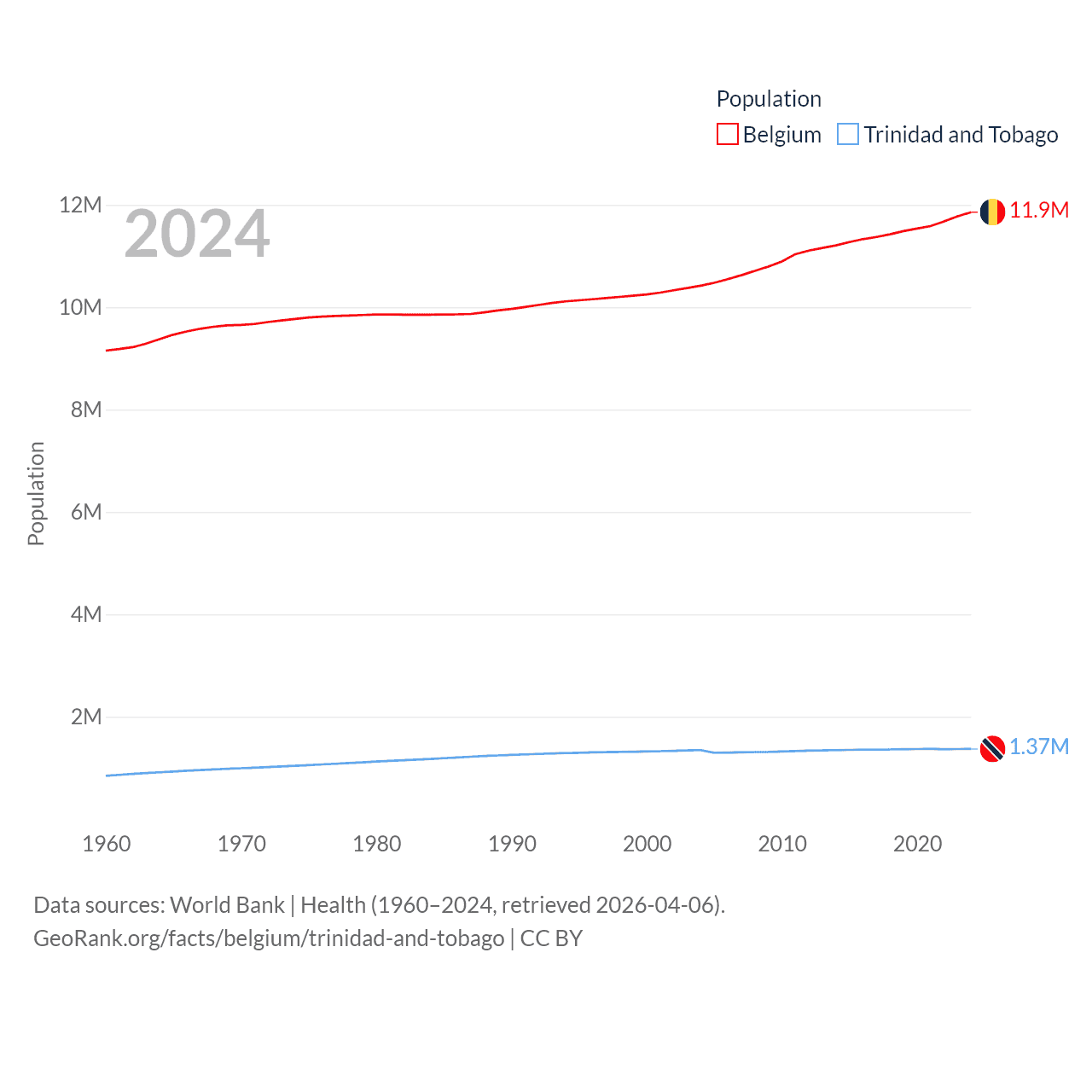 Belgium has a population of 11.9M (ranked 82/197), compared with 1.37M in Trinidad and Tobago (ranked 154/197). Belgium's land area is 11,774 sq mi versus 1,981 sq mi for Trinidad and Tobago (ranked 136th vs. 166th).