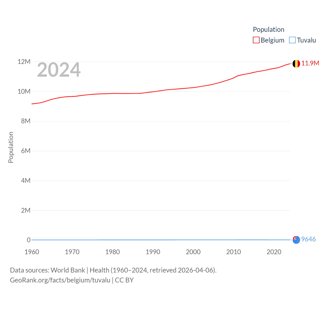 Belgium has a population of 11.9M (ranked 82/197), compared with 9.65K in Tuvalu (ranked 196/197). Belgium's land area is 11,774 sq mi versus 11.6 sq mi for Tuvalu (ranked 136th vs. 194th).