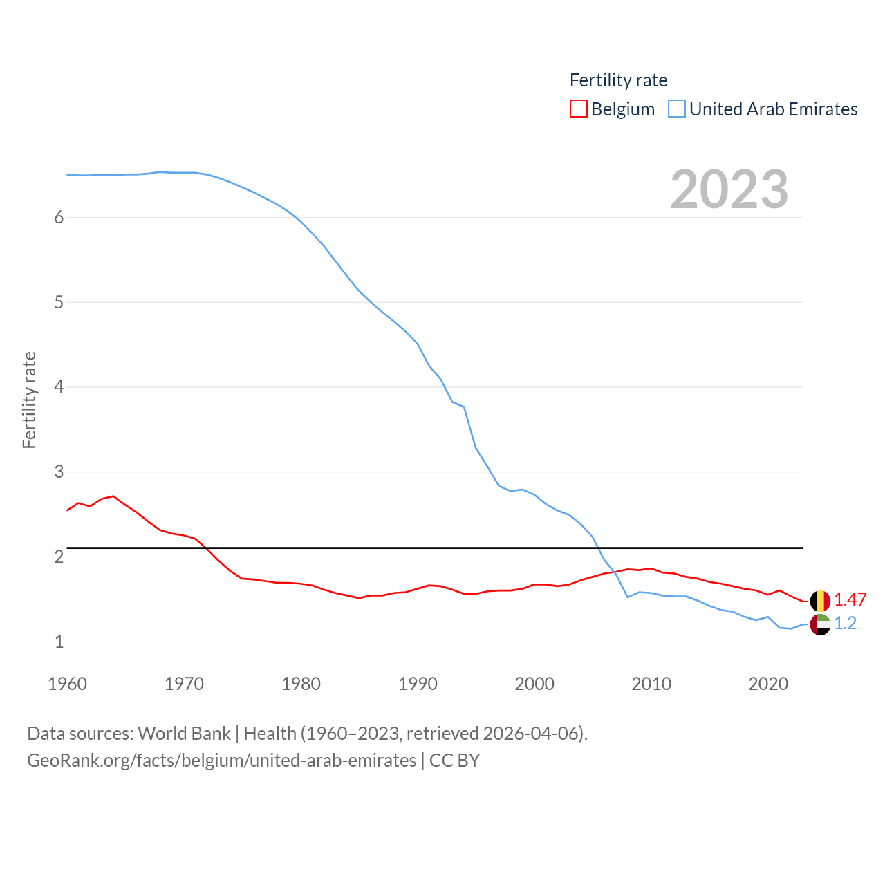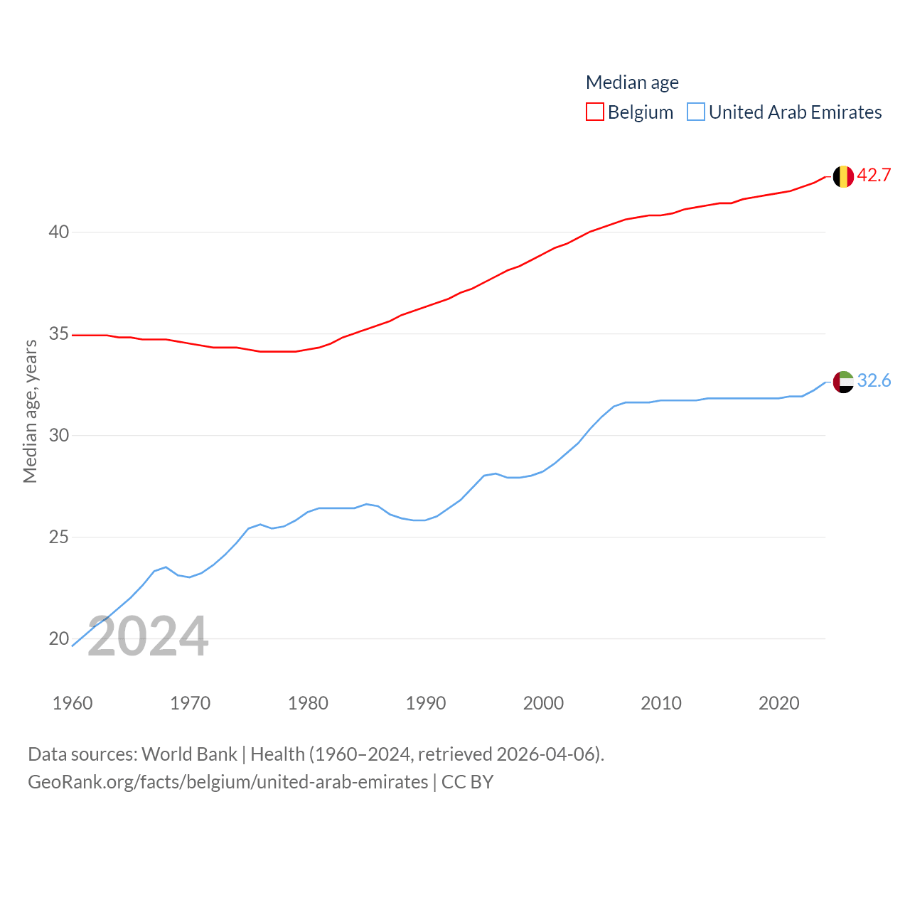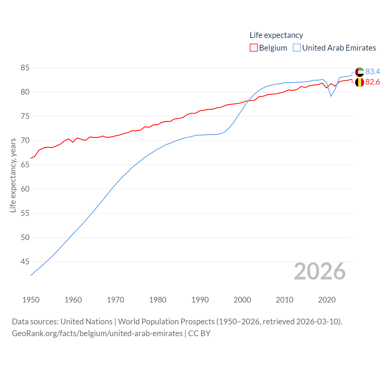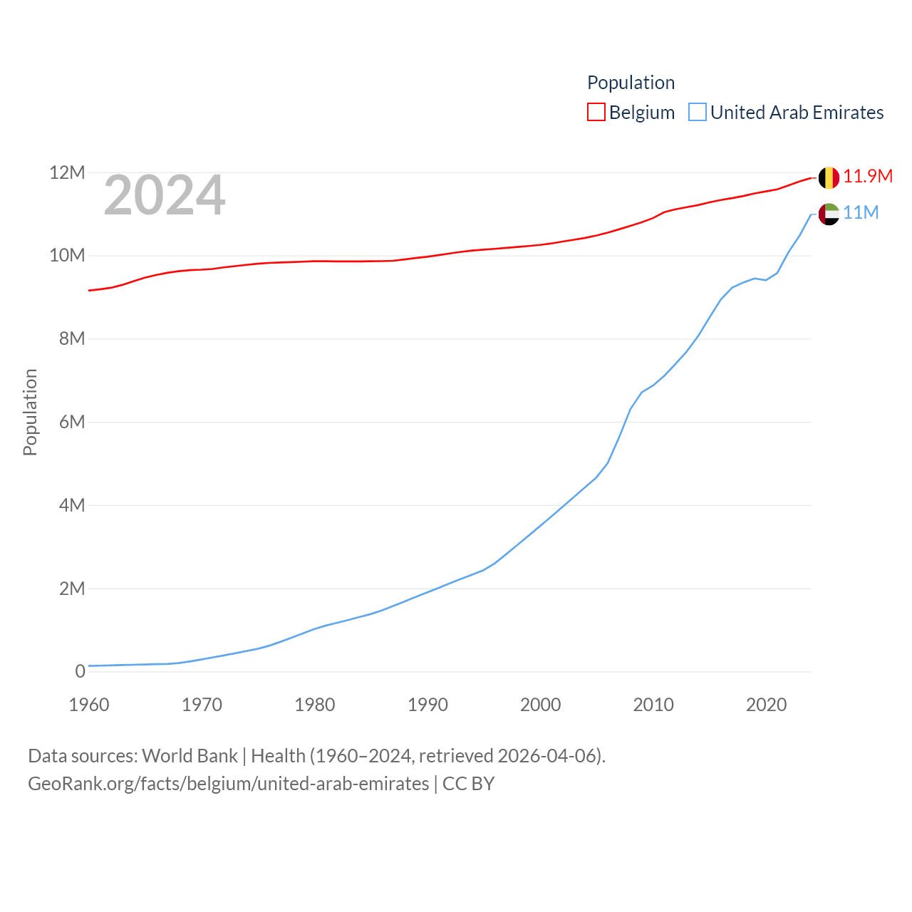 Belgium has a population of 11.9M (ranked 82/197), compared with 11M in The United Arab Emirates (ranked 86/197). Belgium's land area is 11,774 sq mi versus 27,421 sq mi for The United Arab Emirates (ranked 136th vs. 117th).