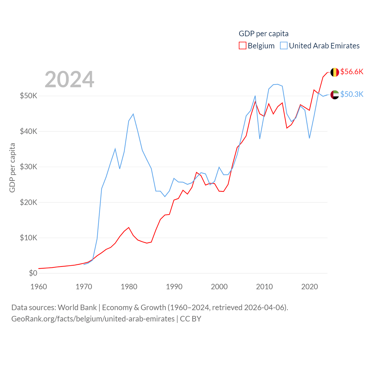 By GDP, Belgium ranks 23/197 ($671B) and The United Arab Emirates ranks 27/197 ($552B). By GDP per capita, Belgium ranks 18/197 ($56,615), while The United Arab Emirates ranks 24/197 ($50,274).