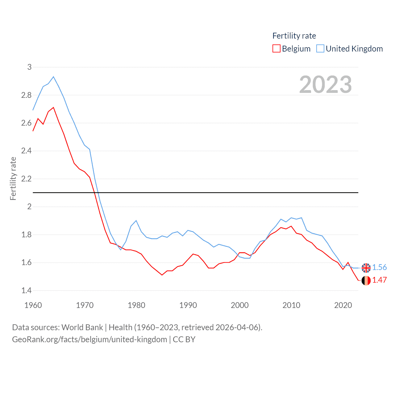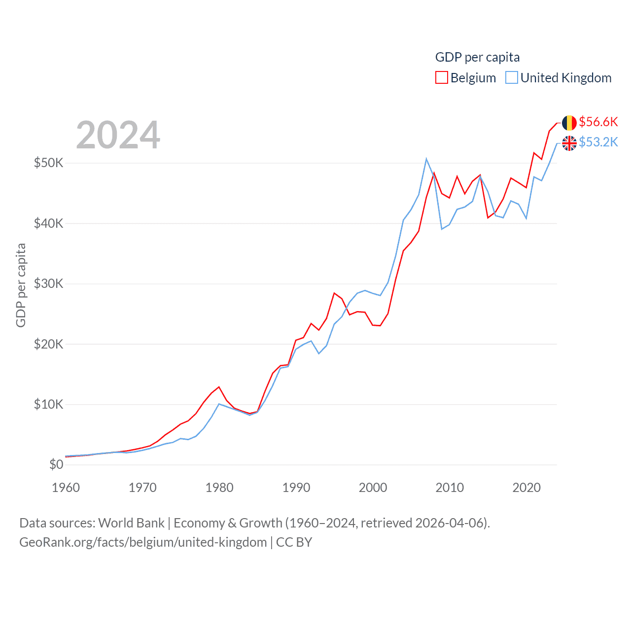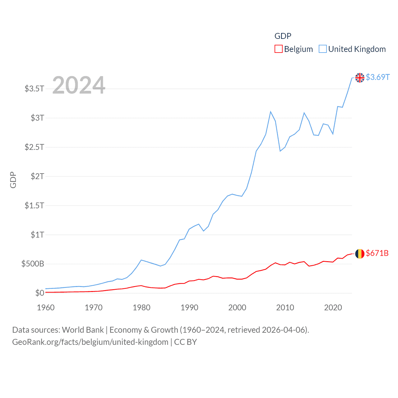 By GDP, Belgium ranks 23/197 ($671B) and The United Kingdom ranks 6/197 ($3.69T). By GDP per capita, Belgium ranks 18/197 ($56,615), while The United Kingdom ranks 22/197 ($53,246).