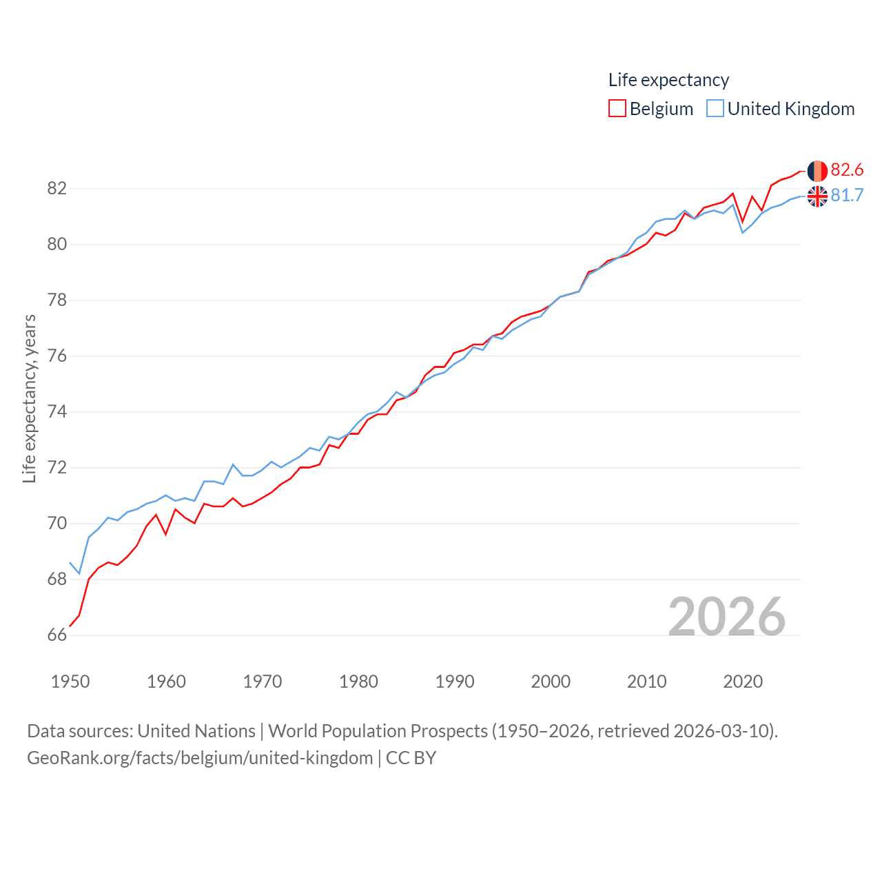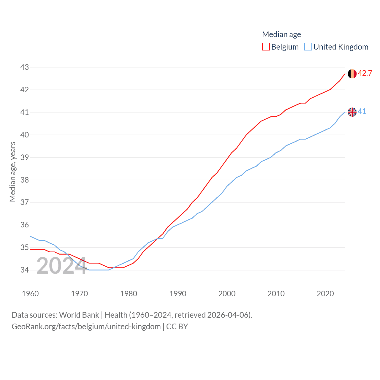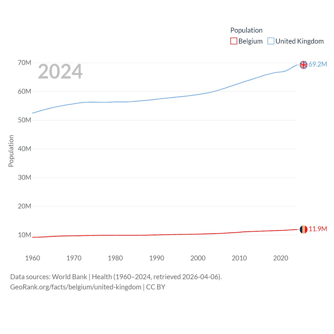 Belgium has a population of 11.9M (ranked 82/197), compared with 69.2M in The United Kingdom (ranked 21/197). Belgium's land area is 11,774 sq mi versus 93,410 sq mi for The United Kingdom (ranked 136th vs. 78th).