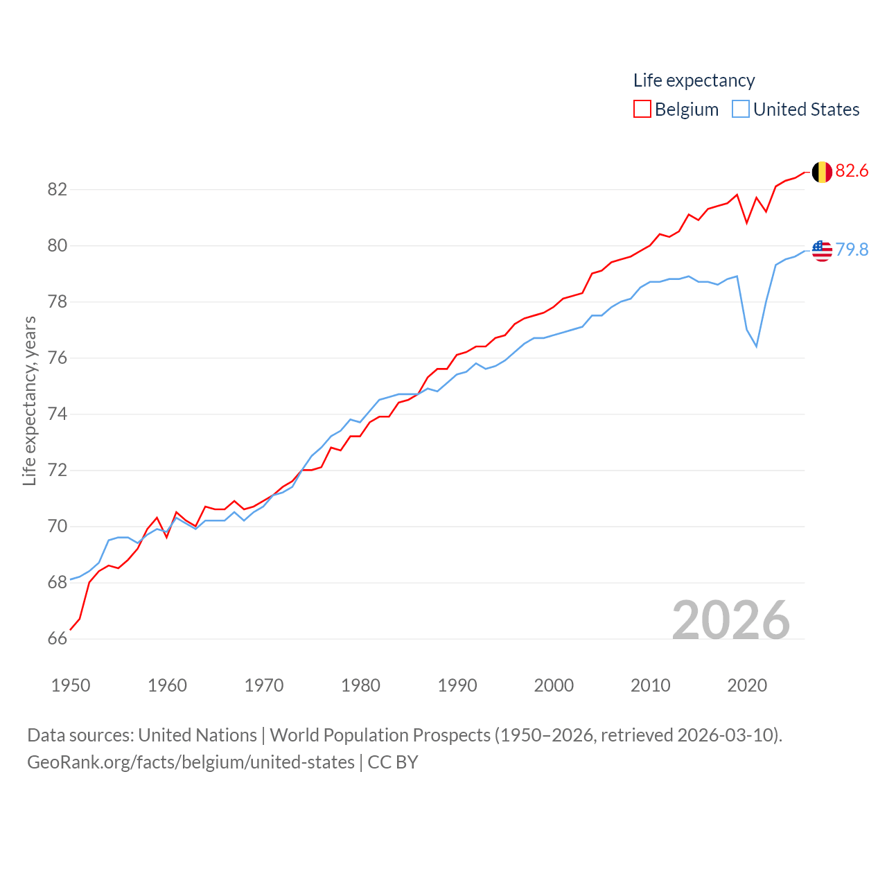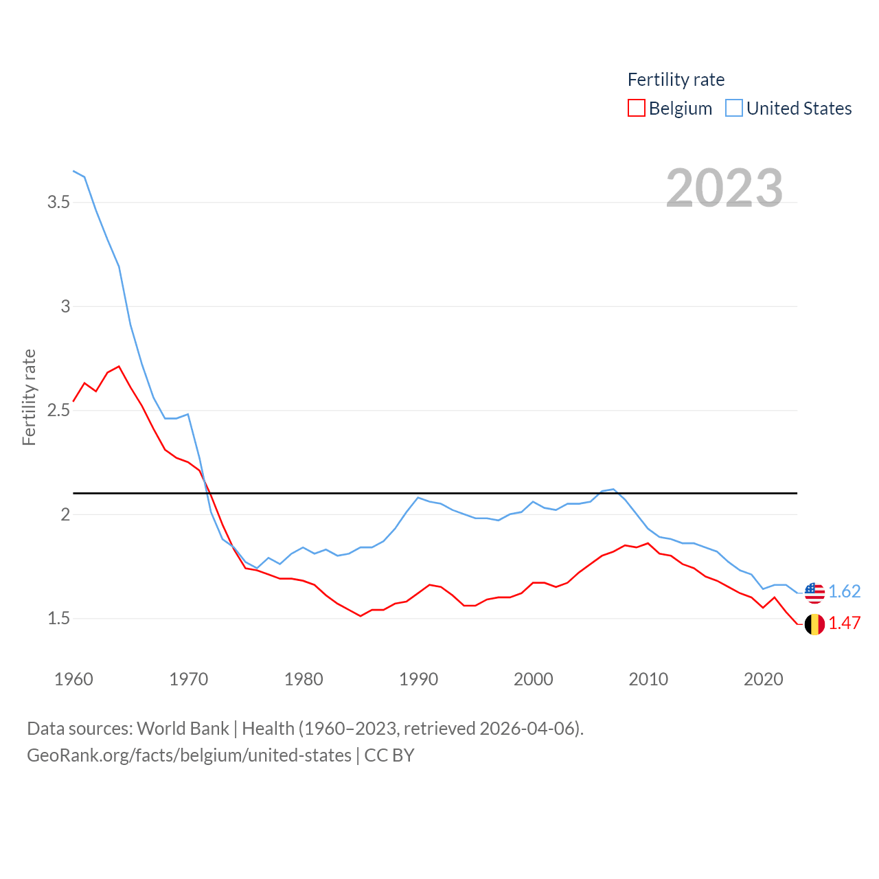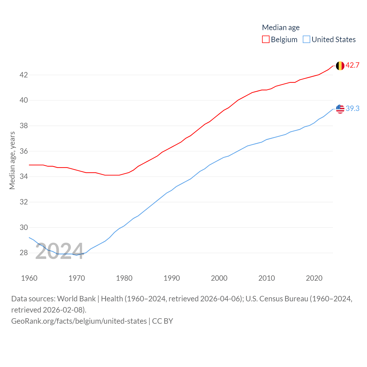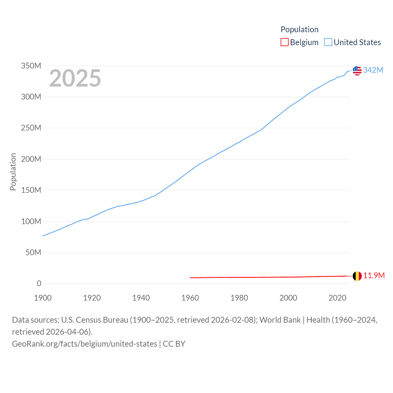 Belgium has a population of 11.9M (ranked 82/197), compared with 342M in The United States (ranked 3/197). Belgium's land area is 11,774 sq mi versus 3,531,839 sq mi for The United States (ranked 136th vs. 3rd).