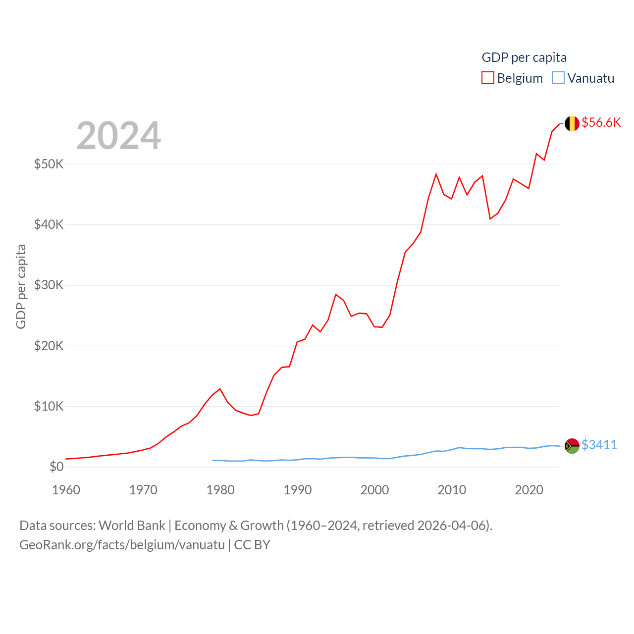 By GDP, Belgium ranks 23/197 ($671B) and Vanuatu ranks 188/197 ($1.12B). By GDP per capita, Belgium ranks 18/197 ($56,615), while Vanuatu ranks 137/197 ($3,411).