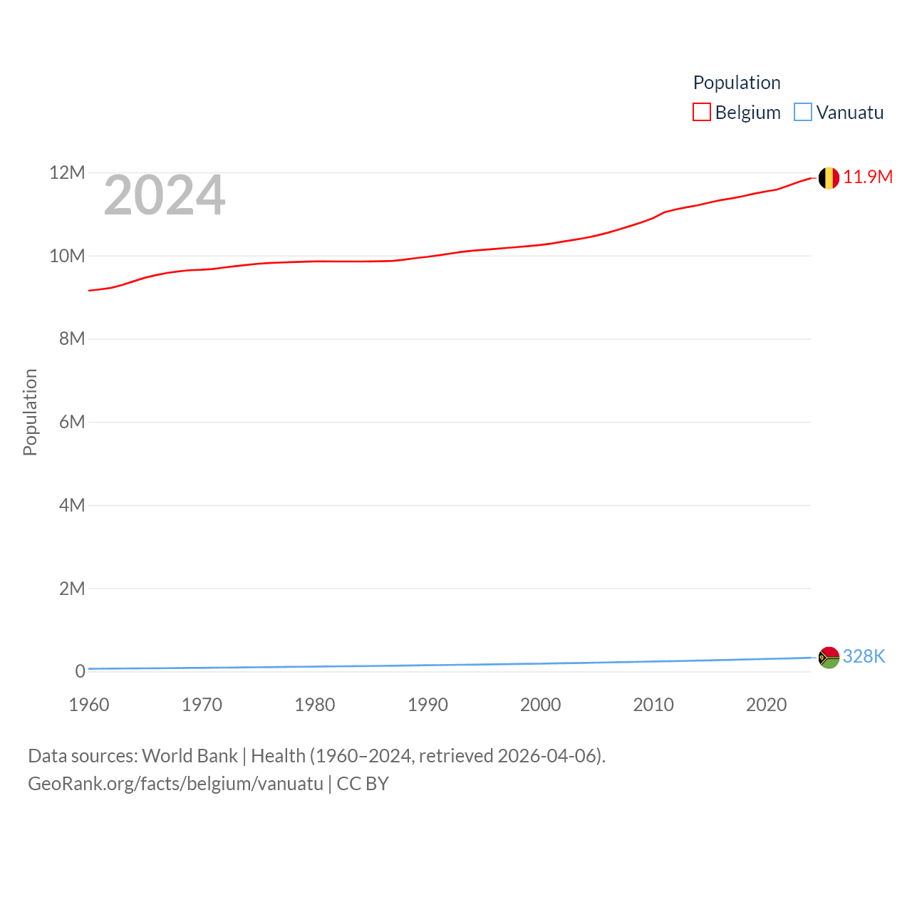 Belgium has a population of 11.9M (ranked 82/197), compared with 328K in Vanuatu (ranked 174/197). Belgium's land area is 11,774 sq mi versus 4,707 sq mi for Vanuatu (ranked 136th vs. 157th).