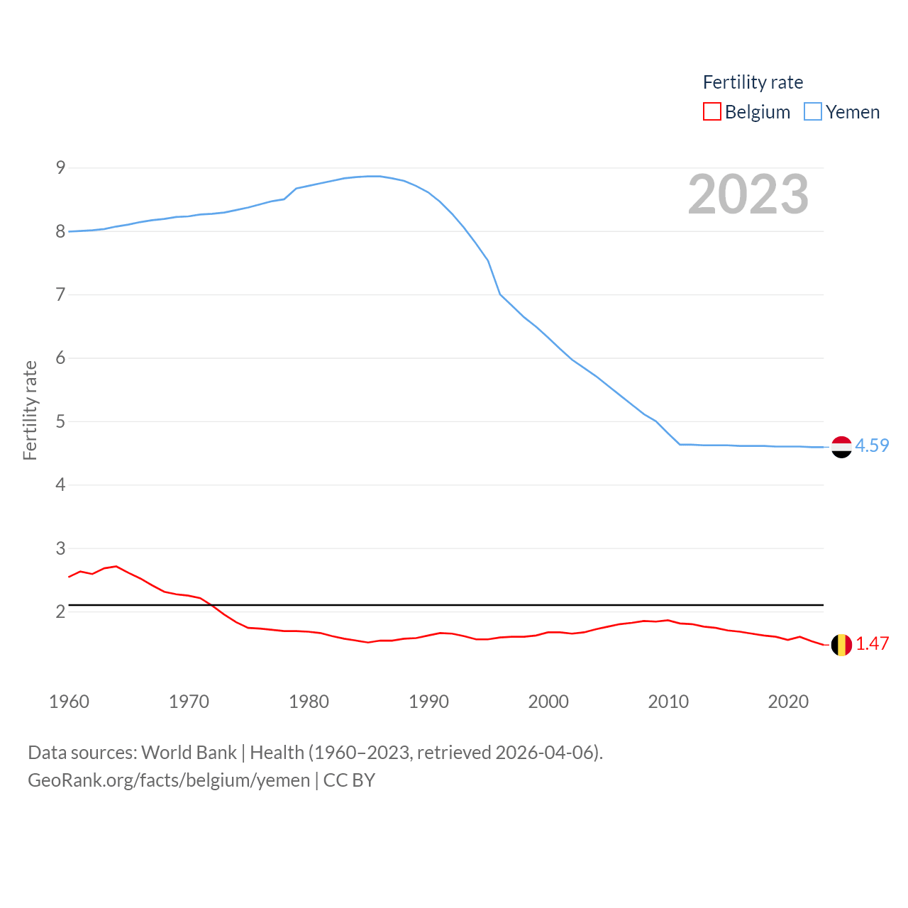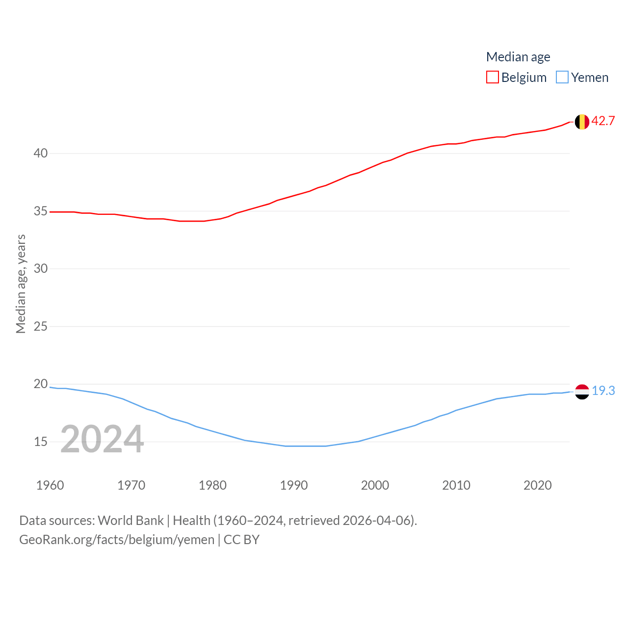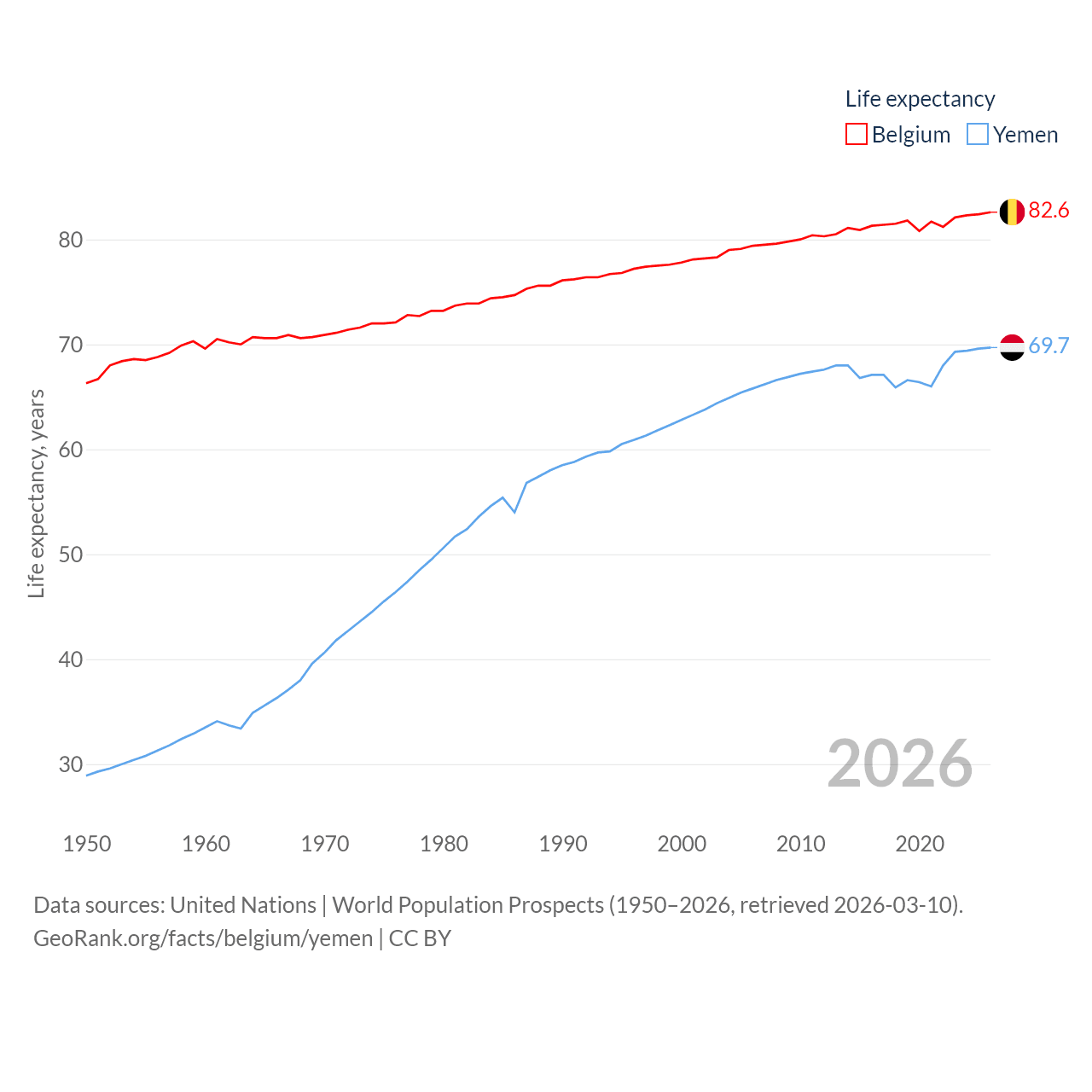 Belgium has a population of 11.9M (ranked 82/197), compared with 40.6M in Yemen (ranked 38/197). Belgium's land area is 11,774 sq mi versus 203,850 sq mi for Yemen (ranked 136th vs. 49th).