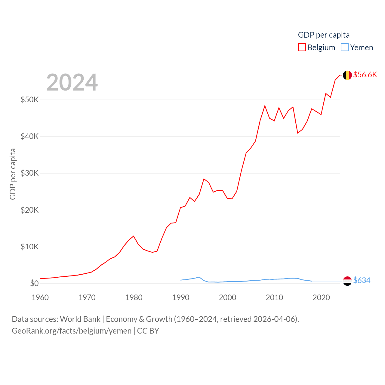 By GDP, Belgium ranks 23/197 ($671B) and Yemen ranks 125/197 ($21.6B). By GDP per capita, Belgium ranks 18/197 ($56,615), while Yemen ranks 191/197 ($634).